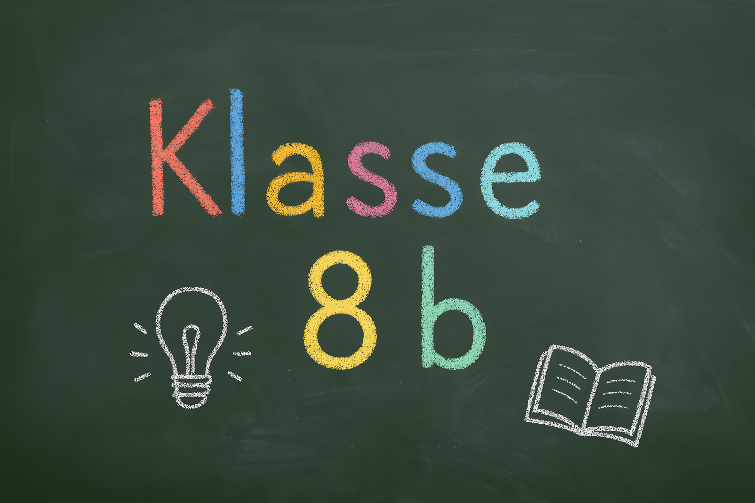 Dieses Stockfoto zeigt eine grüne Tafel mit bunter Kreide beschriftet mit 'Klasse 8b'. Daneben sind zwei Symbole zu sehen: eine Glühbirne als Symbol für Ideen und ein aufgeschlagenes Buch als Symbol für Bildung. Die Tafel erinnert an einen typischen Klassenraum und vermittelt einen Eindruck vom Schulalltag. Das hochauflösende Bild kann für Blogbeiträge, Newsletter, Präsentationen oder Social-Media-Inhalte rund um die Themen Bildung, Schule, Lernen und Kreativität genutzt werden. Es steht unter einer Creative-Commons-Lizenz zur kostenlosen Verwendung zur Verfügung.