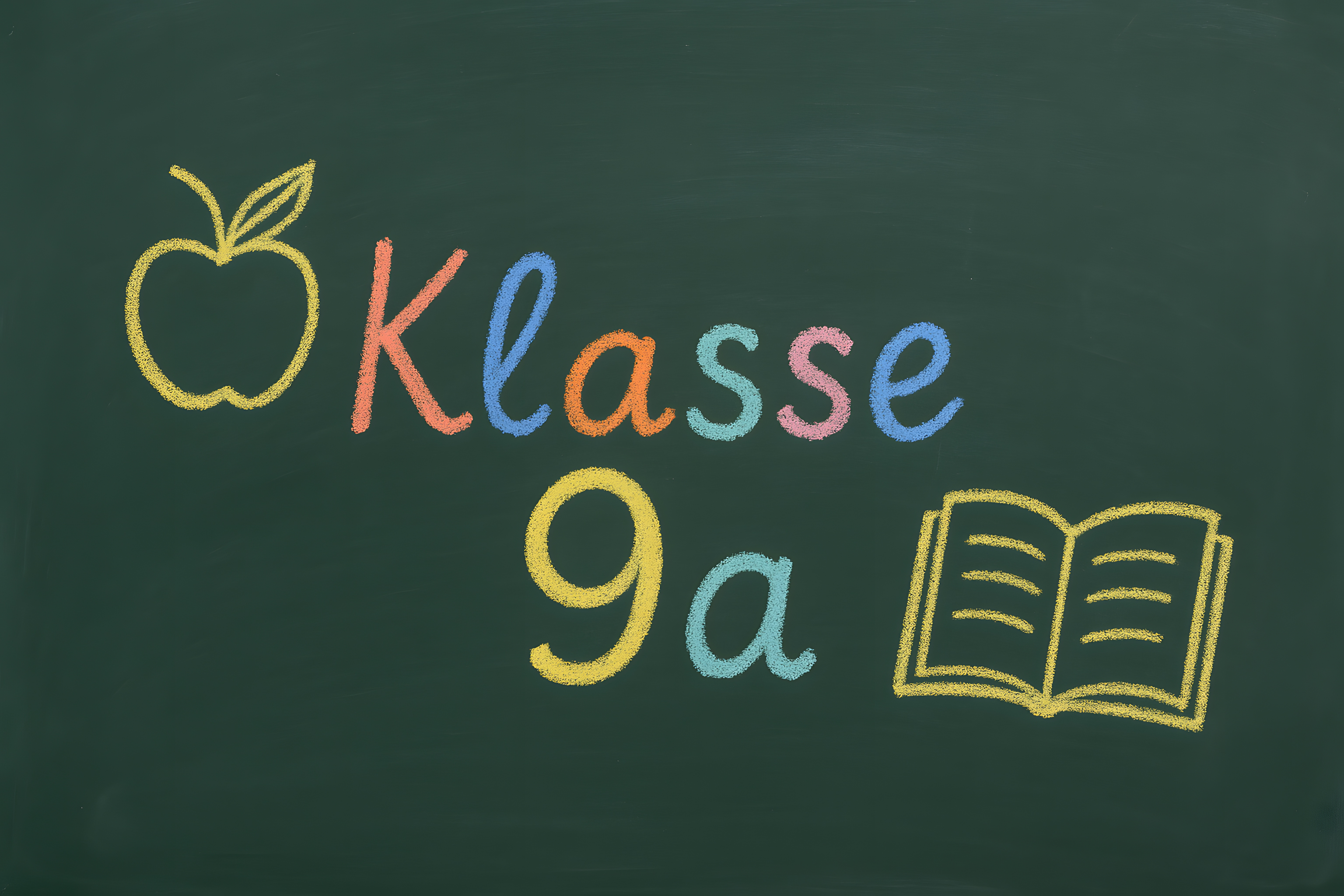 Das Bild zeigt eine grüne Schultafel, auf der mit bunter Kreide die Beschriftung 'Klasse 9a' zusammen mit einem gemalten Apfel und einem offenen Buch zu sehen sind. Die farbige, kindliche Gestaltung vermittelt einen fröhlichen, einladenden Eindruck und lässt an eine Unterrichtssituation in einer Schule denken. Das Foto eignet sich gut als kostenloses Stockfoto für Blog-Beiträge, Newsletter oder Social-Media-Posts rund um Themen wie Bildung, Lernen, Schule oder Klassengemeinschaft. Die hochauflösende Datei ist unter einer Creative-Commons-Lizenz frei nutzbar.