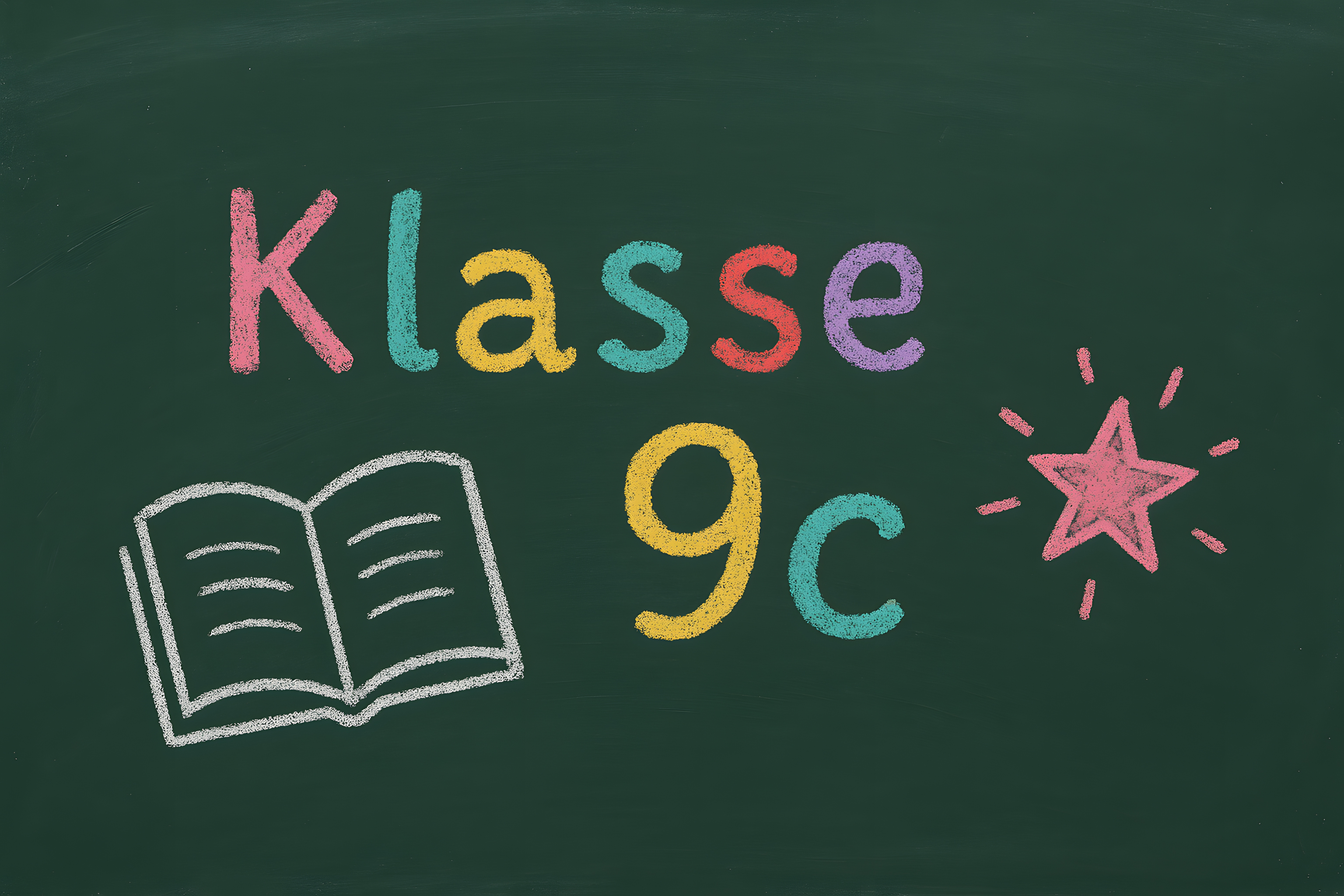 Das Bild zeigt eine Schultafel mit einer bunten Beschriftung 'Klasse 9c'. Die Tafel ist grün und die Beschriftung und Symbole sind in kräftigen Farben wie Pink, Gelb, Türkis und Lila gehalten. Neben dem Klassennamen '9c' sind auch ein Buch-Symbol und ein Stern-Symbol zu sehen, die auf den Lerninhalt und die Leistungen der Klasse hinweisen könnten. Das Motiv eignet sich hervorragend als kostenloses Stockfoto für Blogs, Newsletter, Social-Media-Beiträge oder Werbematerial rund um Themen wie Schule, Bildung, Unterricht und Lernen. Die hohe Auflösung und die Creative-Commons-Lizenz erlauben eine vielseitige Verwendung.