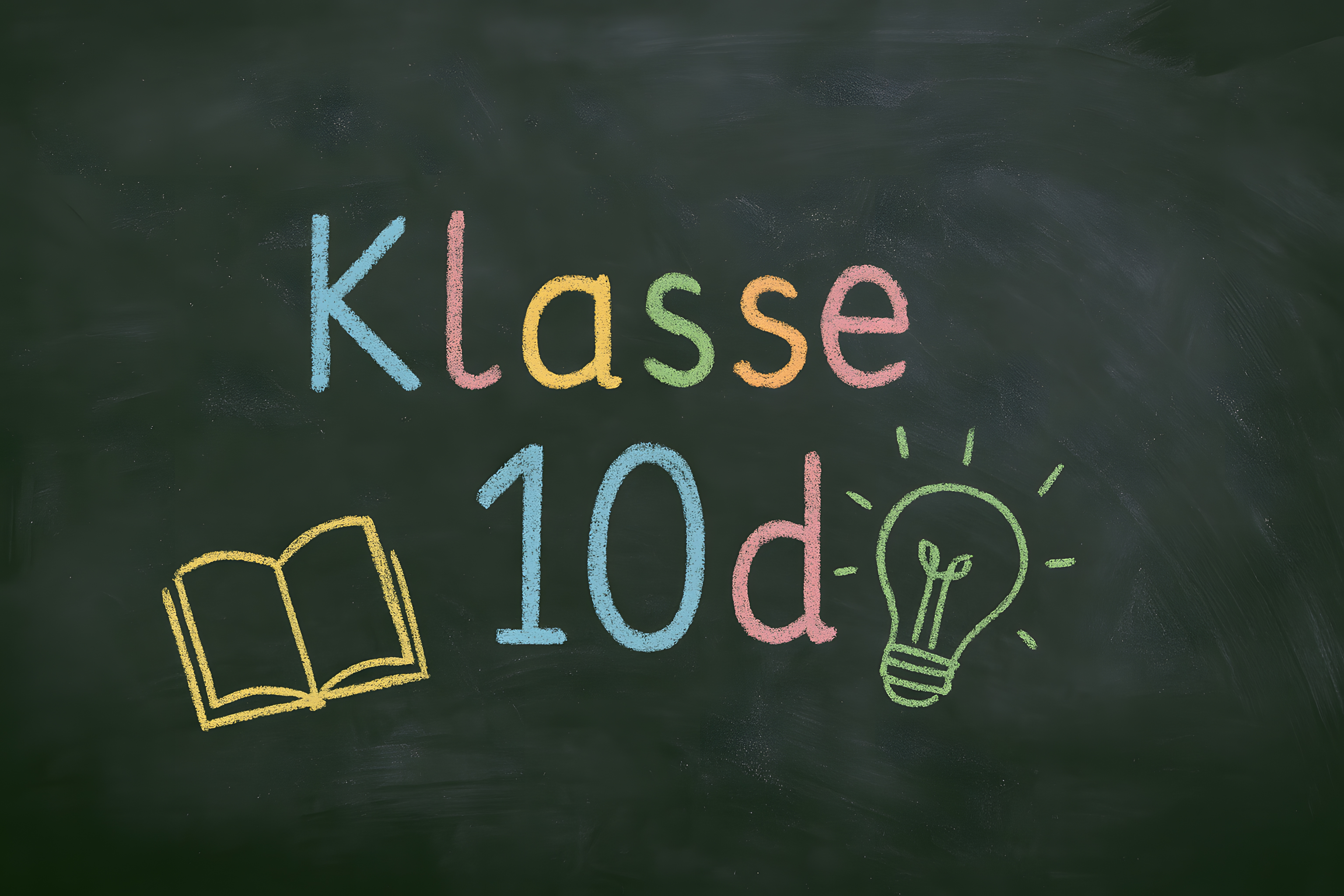Dieses Foto zeigt eine bunte Kreide-Tafel mit der Aufschrift 'Klasse 10d'. Darauf befinden sich verschiedene farbige Symbole wie ein Schulbuch und eine Glühbirne, die auf die unterschiedlichen Unterrichtsfächer und kreatives Lernen hinweisen. Die Tafel vermittelt einen lebendigen, dynamischen Eindruck und eignet sich hervorragend als kostenloses Stockfoto für Bildungskampagnen, Lernressourcen oder Schulwerbung in hoher Auflösung und unter Creative-Commons-Lizenz.