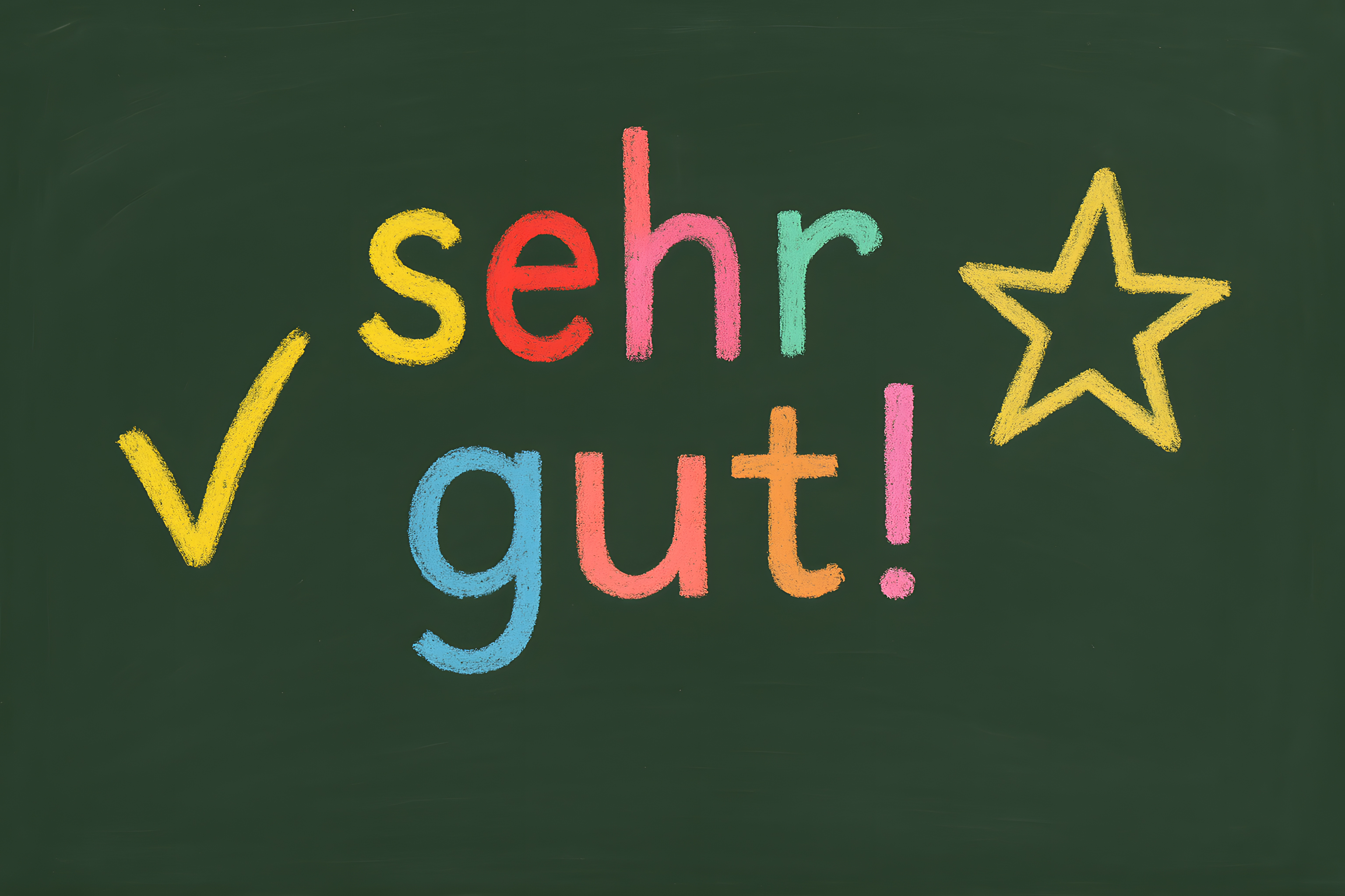 Das Bild zeigt eine grüne Kreidetafel, auf der der Schriftzug 'sehr gut!' in leuchtenden Pastellfarben geschrieben steht. Neben dem Lob-Spruch ist ein gelber Stern zu sehen, der das positive Feedback zusätzlich betont. Die farbenfrohe Gestaltung und der ermunternde Charakter des Textes machen dieses Foto zu einem idealen Motiv für Anwendungen im Bildungsbereich, wie Lernmaterialien, Schulwebsites oder Motivationsplakate. Als kostenloses Stockfoto in hoher Auflösung und unter einer Creative-Commons-Lizenz nutzbar, eignet es sich bestens für eine Vielzahl an digitalen Projekten.