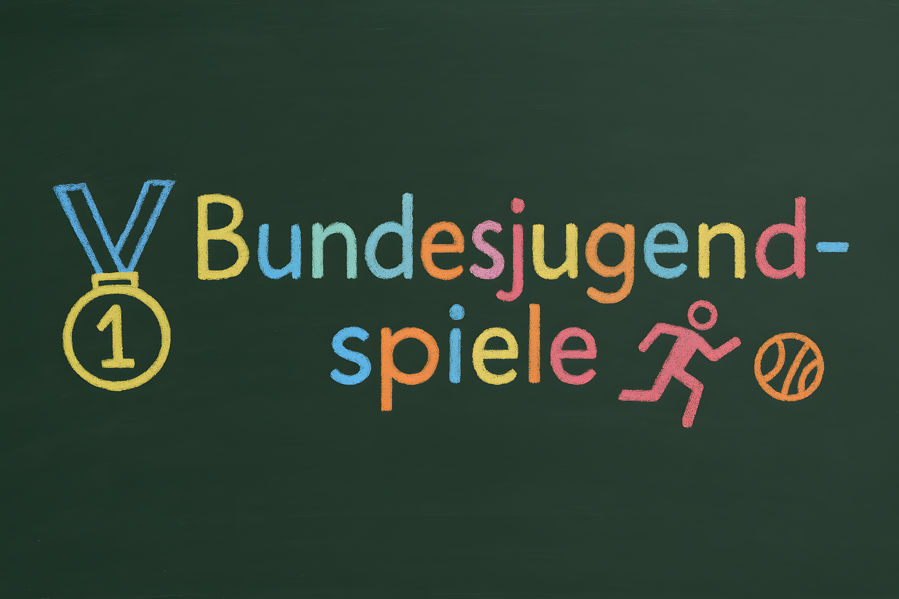 Das Bild zeigt eine bunte Illustration der Bundesjugendspiele, einer jährlichen Sportveranstaltung für Kinder und Jugendliche in Deutschland. Die Illustration ist in Kreide auf einer grünen Tafel gemalt und zeigt eine Goldmedaille sowie verschiedene Sportpiktogramme wie Laufen, Sprung und Basketball. Die farbenfrohe Darstellung verleiht dem Bild eine lebendige und fröhliche Atmosphäre, die gut zu einer Schulveranstaltung wie den Bundesjugendspielen passt. Dieses kostenlose Stockfoto in hoher Auflösung kann für Blog-Beiträge, Newsletter, Social-Media-Kanäle oder Werbematerialien rund um Bildung, Sport und Wettbewerbe verwendet werden und steht unter einer Creative-Commons-Lizenz zur Verfügung.