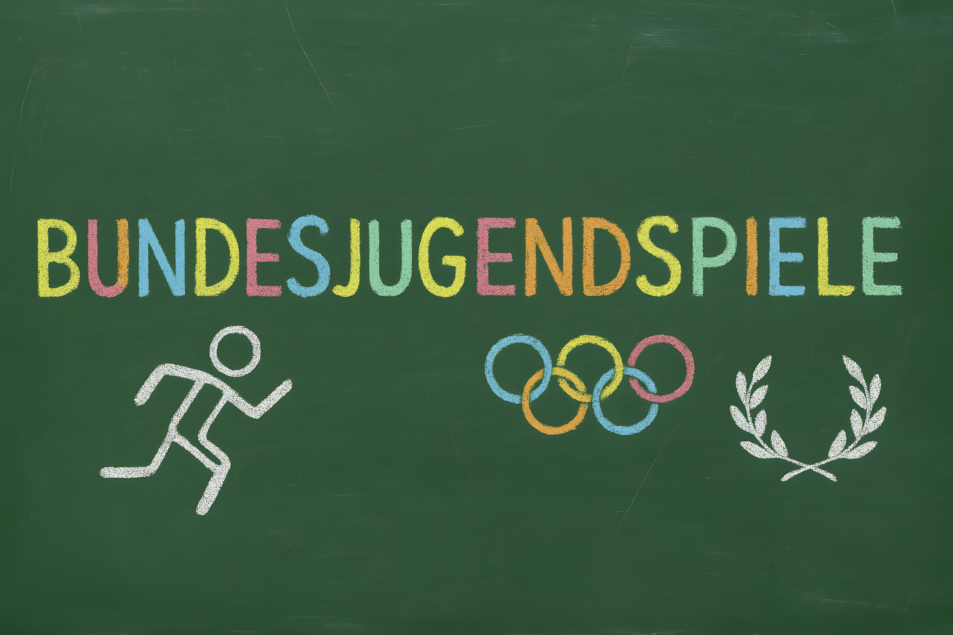 Das Bild zeigt eine Tafel, die mit bunter Kreide beschriftet ist. Der Text lautet 'BUNDESJUGENDSPIELE' und ist in verschiedenen Farben wie Gelb, Orange, Blau und Rosa geschrieben. Darunter sind die olympischen Ringe sowie Lorbeerblätter als Symbol für den sportlichen Wettkampf dargestellt. Diese Tafelbeschriftung könnte beispielsweise in einer Schule oder Turnhalle zu finden sein, um Schüler für die jährlich stattfindenden Bundesjugendspiele zu motivieren. Das Foto eignet sich daher hervorragend als kostenloses Stockfoto für Blogbeiträge, Newsletter oder Social-Media-Postings rund um das Thema Schule, Sport und Bildung. Die hohe Auflösung und Creative-Commons-Lizenz ermöglichen eine vielfältige Nutzung.
