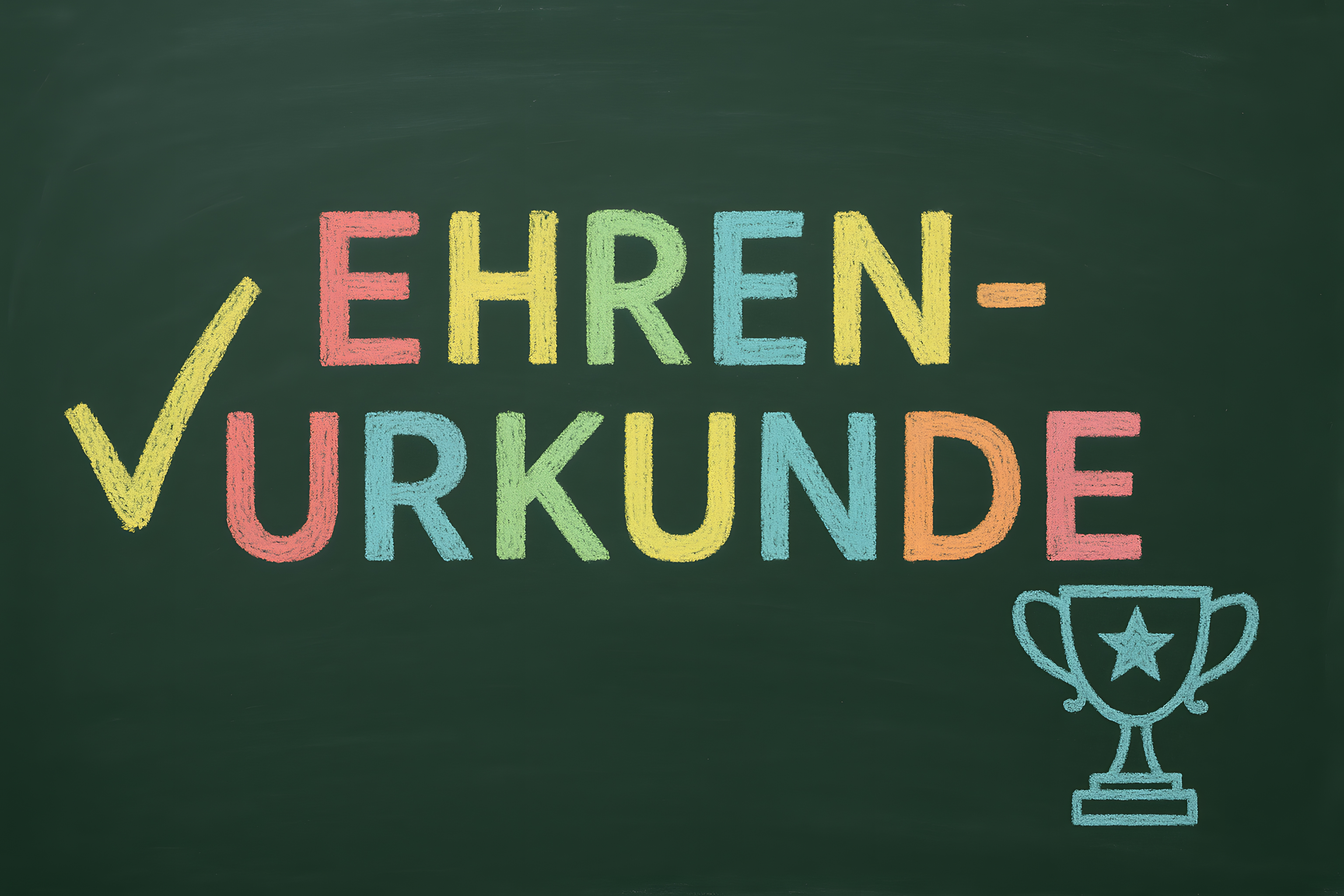 Dieses Bild zeigt eine grüne Tafel mit farbenfroher Beschriftung 'EHREN-URKUNDE' und einem Pokal-Symbol. Die Buchstaben sind in verschiedenen Pastelltönen wie Gelb, Rot, Grün und Blau gehalten, was dem Bild eine freundliche und lebendige Ausstrahlung verleiht. Dieses kostenlose Stockfoto in hoher Auflösung kann für Lehrmaterial, Bildungskampagnen, Blogs oder Social-Media-Posts zum Thema Leistung, Erfolg und Anerkennung verwendet werden. Es steht unter der Creative-Commons-Lizenz zur Verfügung.