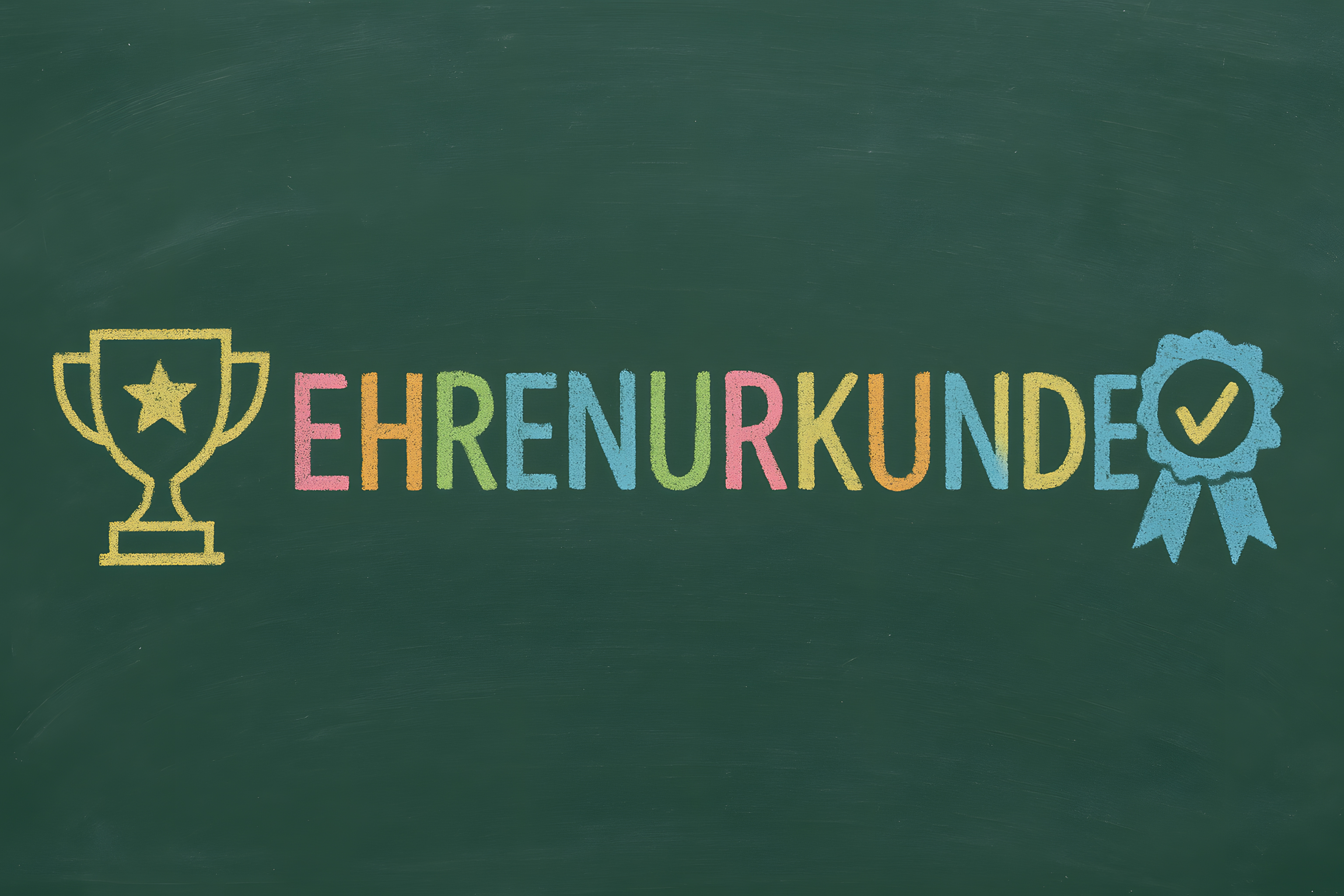 Dieses Foto zeigt eine bunte Ehrenurkunde, die auf einer grünen Schultafel zu sehen ist. Die Urkunde ist mit einem goldenen Pokal und einer blauen Auszeichnungsschleife verziert. Die Aufschrift 'Ehrenurkunde' ist in verschiedenen Farben gestaltet, was einen kreativen und verspielten Eindruck erweckt. Das Bild eignet sich gut als kostenloses Stockfoto für den Einsatz in Blogbeiträgen, Newslettern, Social-Media-Beiträgen oder Werbekampagnen rund um die Themen Bildung, Schule, Erfolg und Anerkennung. Die hochauflösende Datei steht unter einer Creative-Commons-Lizenz zur Verfügung.