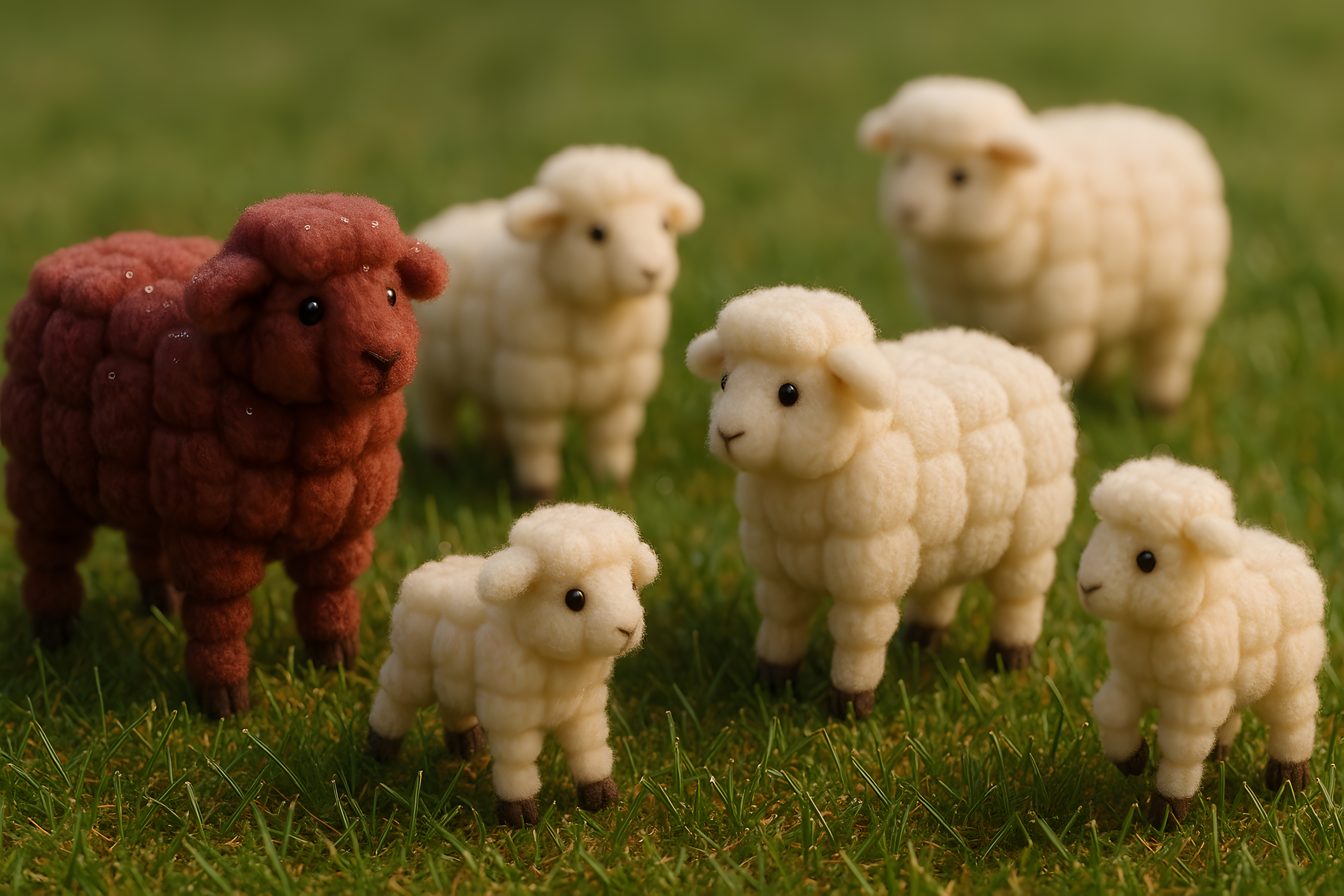 Dieses charmante Foto zeigt eine niedliche Herde aus Schaffiguren aus weichem, kuscheligem Wollfilz, die friedlich auf einer satten, grünen Wiese stehen. Im Vordergrund ist ein braunes Schaf zu sehen, während im Hintergrund mehrere weiße Schafe platziert sind. Die Szene versprüht eine gemütliche, idyllische Atmosphäre und weckt Assoziationen von ländlicher Ruhe, Handwerkskunst und Natürlichkeit. Dieses Stockfoto in hoher Auflösung eignet sich hervorragend für den Einsatz in Blogs, Newslettern, Social-Media-Kanälen oder für Werbezwecke, zum Beispiel in der Dekoration, Textilgestaltung oder Produktfotografie. Es steht unter der Creative-Commons-Lizenz zur freien Nutzung zur Verfügung.