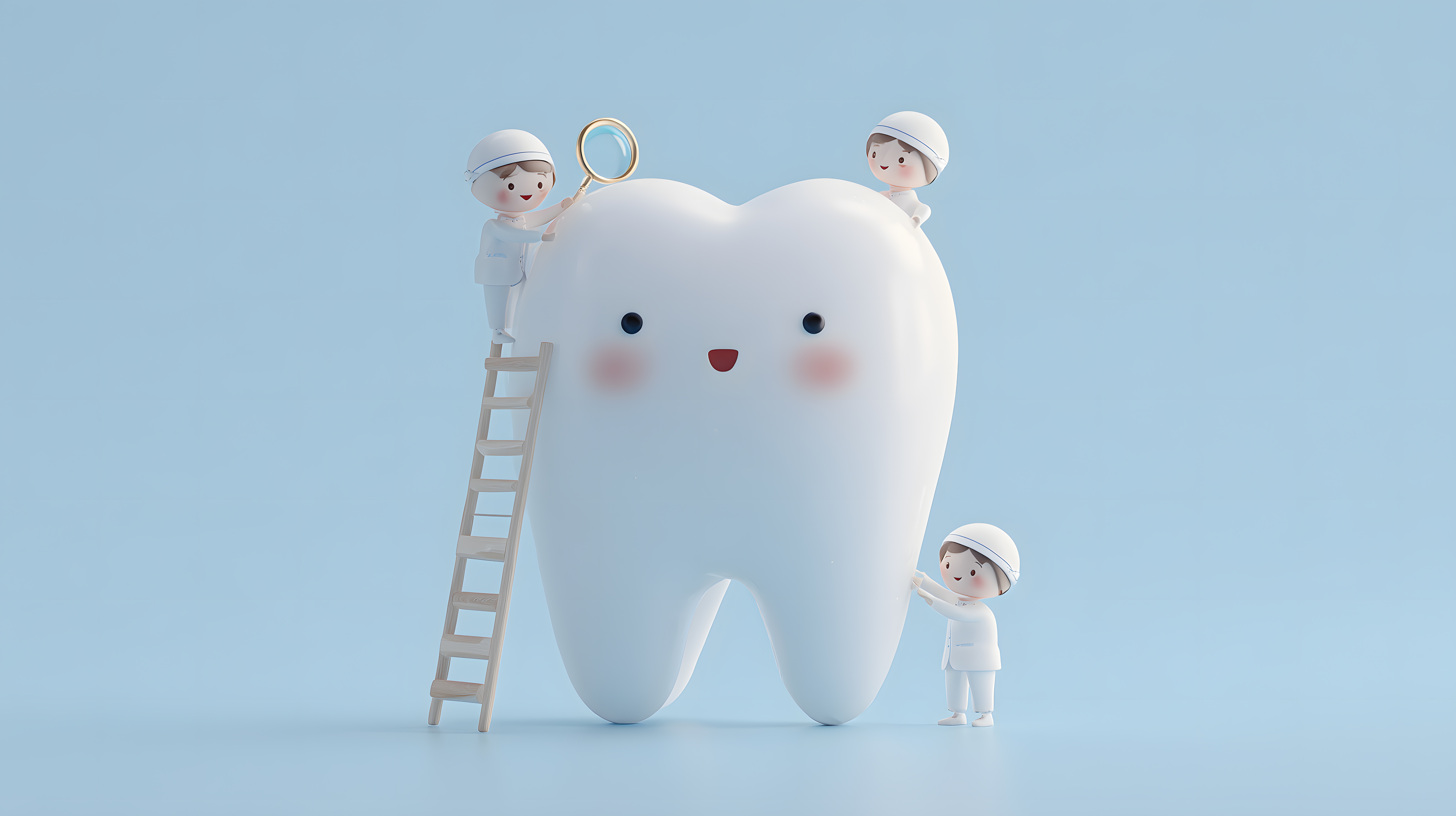 Dieses charmante Bild zeigt eine symbolische Darstellung der Zahnpflege. Es zeigt einen riesigen, lächelnden Zahn, an dem mehrere kleine Cartoon-Figuren in weißen Kitteln arbeiten, die vermutlich Zahnärzte oder Zahnarzthelfende darstellen. Die Figuren klettern auf einer Leiter hinauf zum Zahn, was eine Assoziation mit professioneller Zahnuntersuchung und -behandlung weckt. Die Farbgebung in Weiß und Hellblau verleiht dem Bild eine freundliche, vertrauensvolle Ausstrahlung.