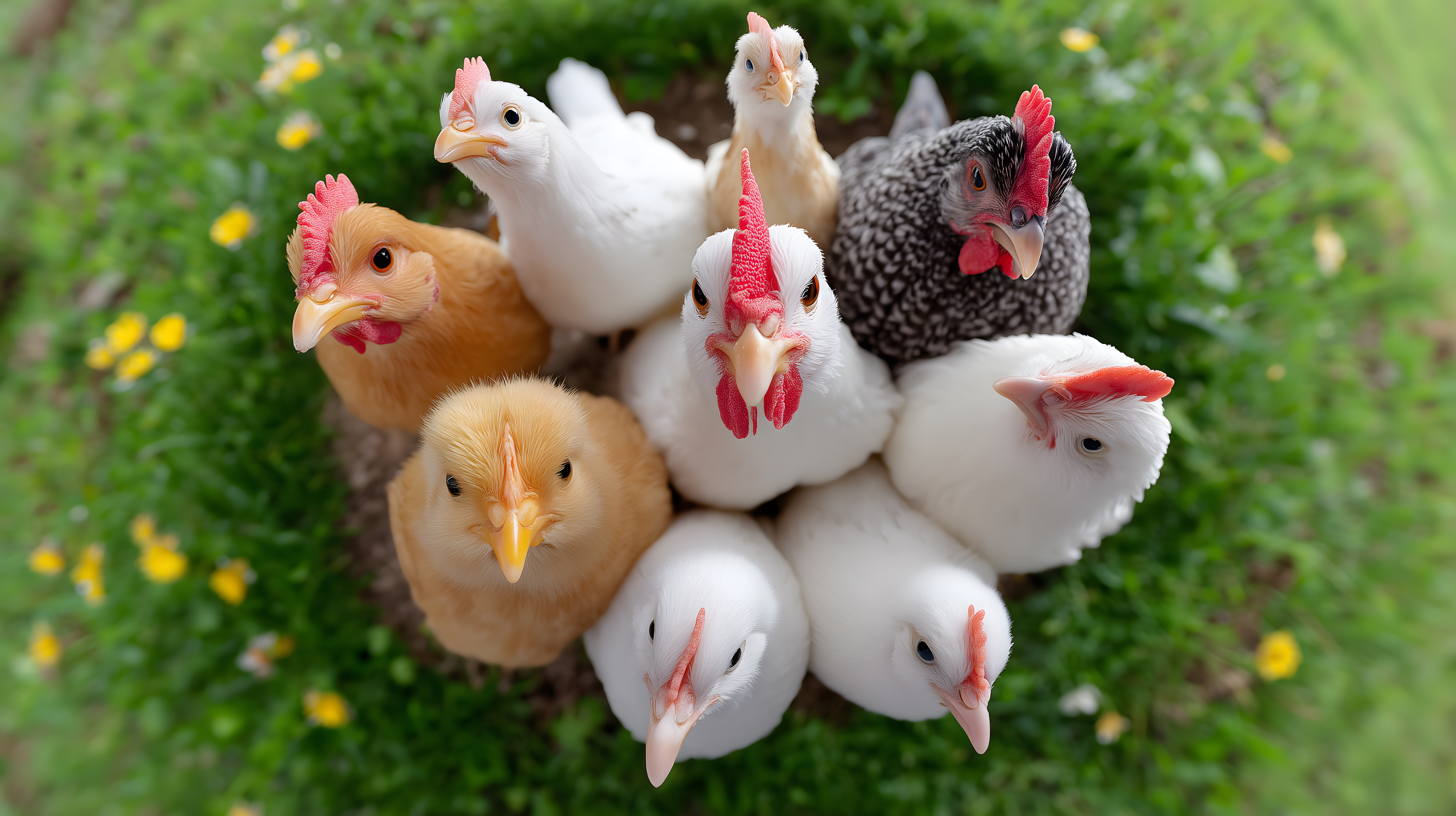Das Foto zeigt eine Gruppe von Hühnern auf einer grünen Wiese. Die Vögel blicken neugierig in die Kamera und bilden eine bunte Herde mit verschiedenen Färbungen - weiß, braun, schwarz. Im Hintergrund ist eine üppige, grüne Vegetation zu sehen, die eine natürliche, ländliche Atmosphäre schafft. Dieses kostenlose Stockfoto eignet sich perfekt für Blogs, Social-Media-Posts oder Werbematerialien rund um das Thema Landwirtschaft, Tierhaltung oder ökologische Lebensmittelproduktion. Die hochauflösenden Bilddaten sind unter der Creative-Commons-Lizenz frei für die kommerzielle Nutzung verfügbar.