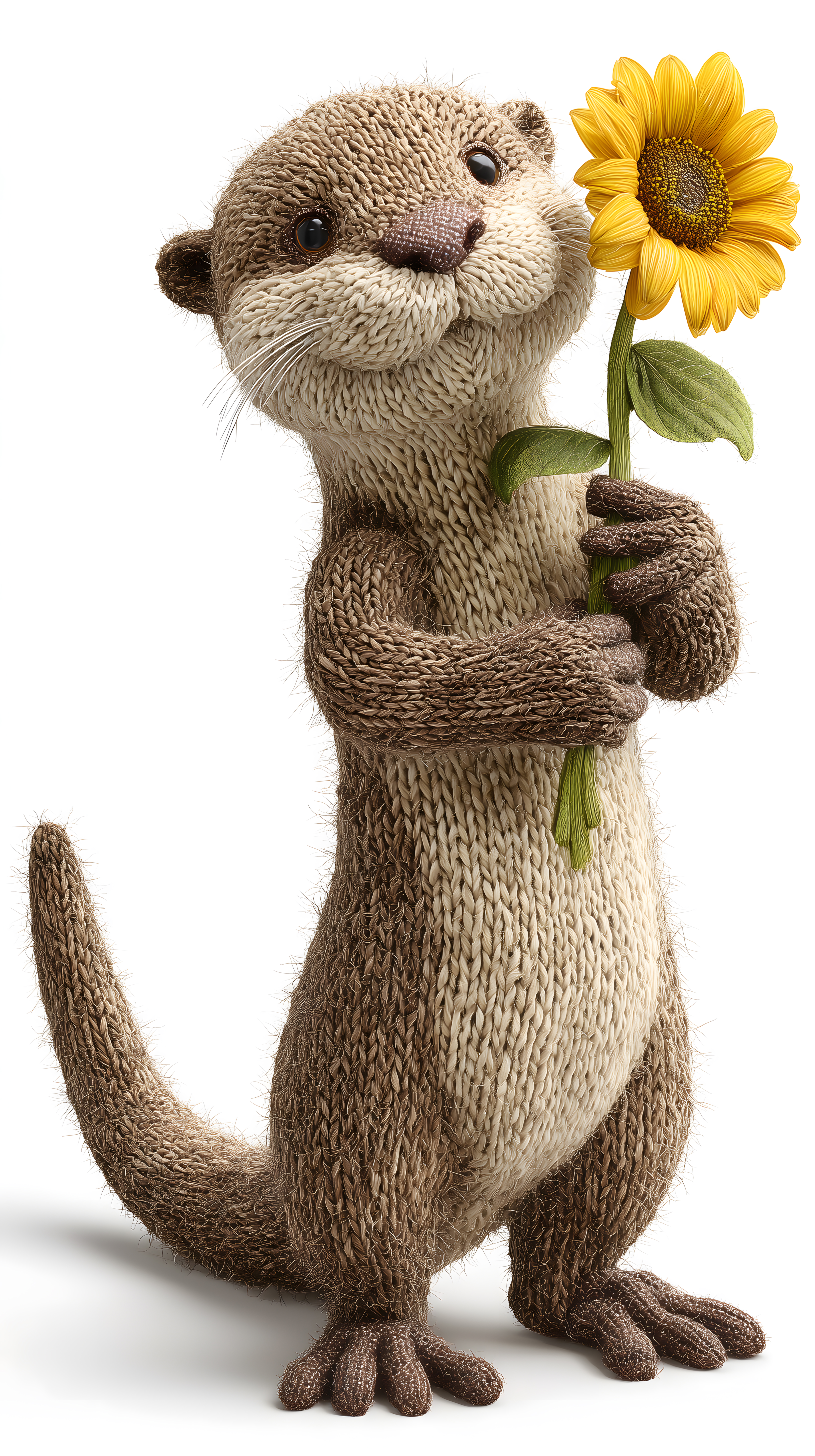 Das Bild zeigt eine entzückende Strickfigur in Form eines Otters, der eine leuchtend gelbe Sonnenblume in den Pfoten hält. Der Otter hat ein weiches, flauschiges Aussehen und eine niedliche, verspielt-fröhliche Ausstrahlung, die durch die Detailgenauigkeit der Strickoptik unterstrichen wird. Der weiße Hintergrund lässt die Figur im Mittelpunkt stehen und verleiht der Darstellung eine klare, fokussierte Ästhetik.
