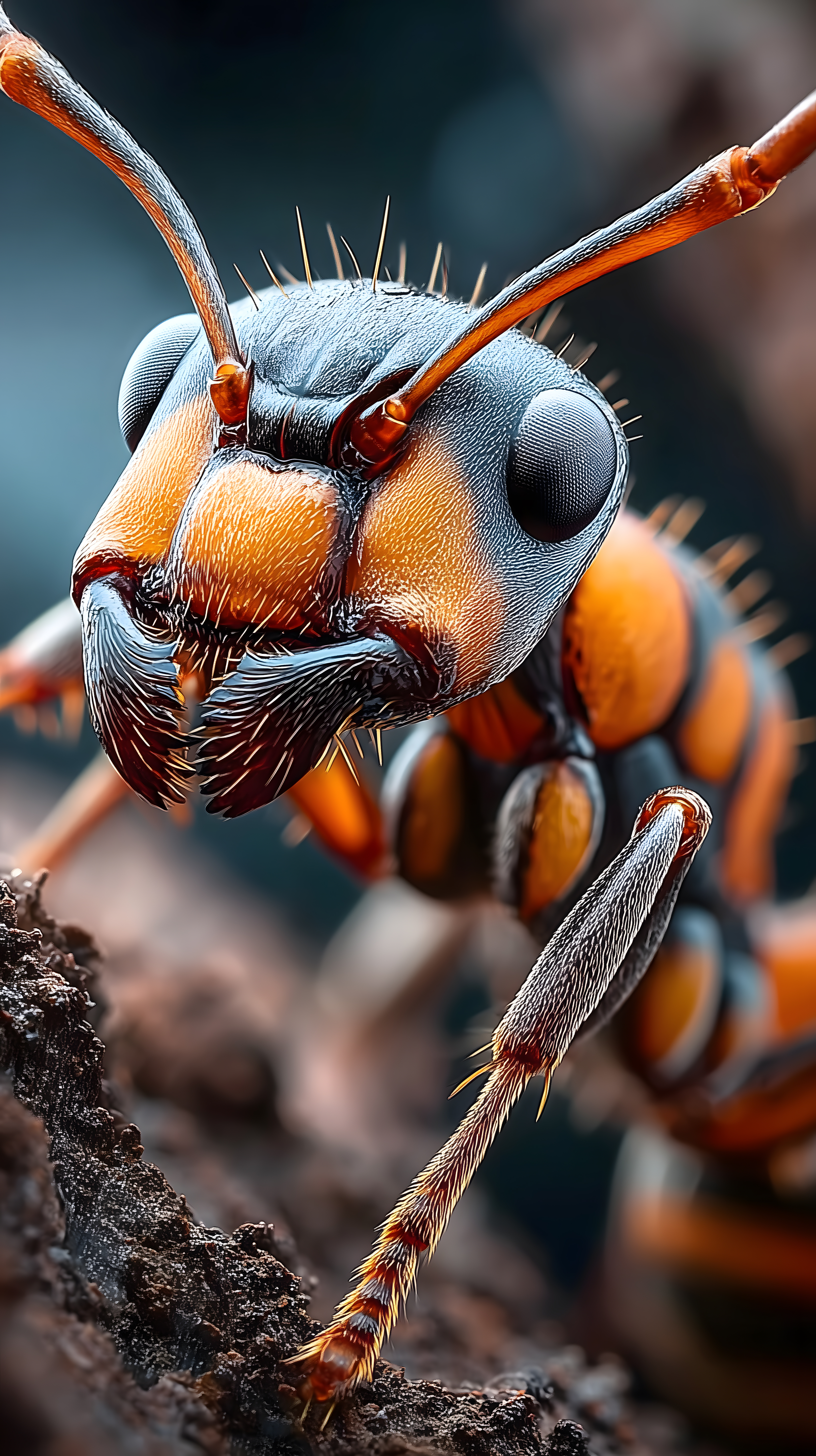Dieses Foto zeigt eine detaillierte Nahaufnahme einer orangefarbenen und schwarz gemusterten Ameise. Durch die extreme Schärfentiefe und Perspektive tritt die faszinierende Struktur und Textur des Insekts deutlich hervor. Die kleinteiligen Facettenaugen, Antennen und Beine sind klar erkennbar. Dieses Makrobild bietet einen einzigartigen Einblick in die Mikrowelt der Ameisen und eignet sich hervorragend als kostenfreies, hochauflösendes Stockfoto für Blogs, Newsletter, soziale Medien oder Werbezwecke unter der Creative Commons-Lizenz.