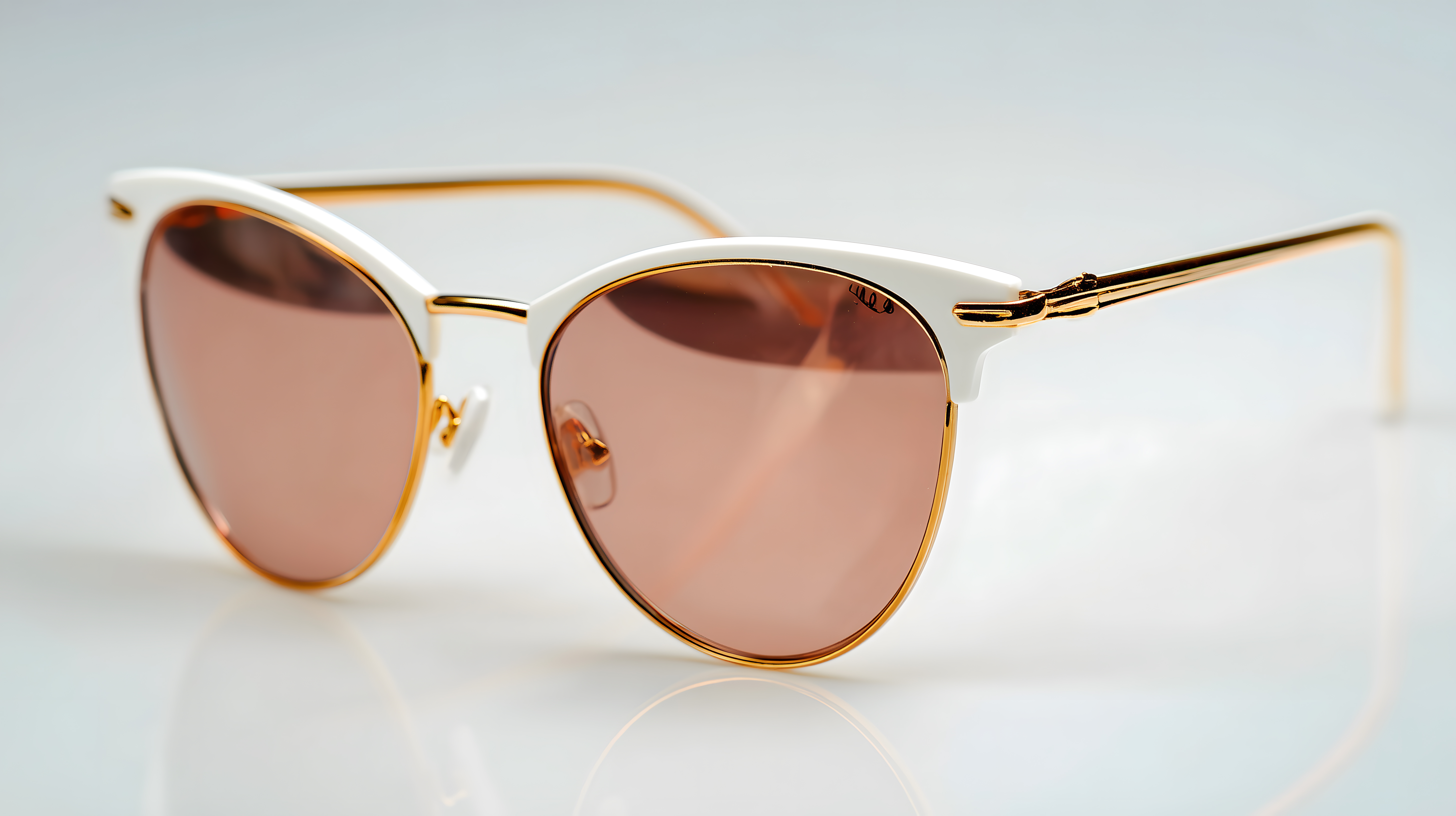 Dieses Produktfoto zeigt eine elegante, goldgerahmte Retro-Sonnenbrille mit weißem Rahmen vor einem neutralen Hintergrund. Die vintage-inspirierte Brille besticht durch ihre klaren Linien und den stilvollen, goldenen Akzent. Das hochformatige Studiofoto präsentiert das Accessoire in perfekter Schärfe und Klarheit. Dieses hochauflösende Stockfoto eignet sich hervorragend für den Einsatz in Blogs, Newslettern, Social-Media-Beiträgen oder Werbematerialien, in denen eine modische, hochwertige Sonnenbrille gezeigt werden soll. Das Bild ist unter einer Creative-Commons-Lizenz kostenlos nutzbar.