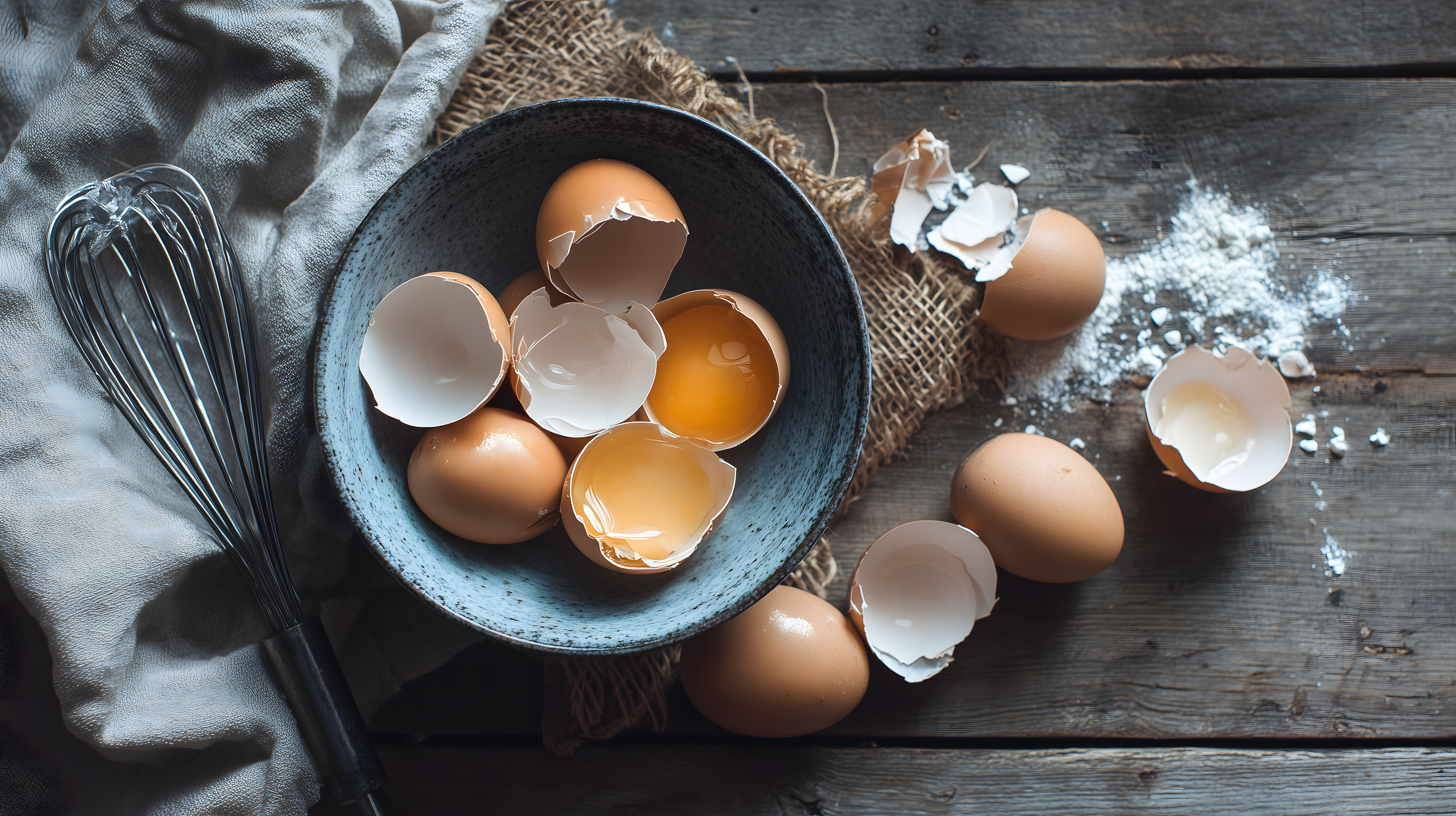 Dieses Foto zeigt eine rustikale Küchenszene mit frischen Eiern, die in einer dunklen Schüssel aufgeschlagen wurden. Die Eier sind teilweise schon zerbrochen und ergießen ihren Inhalt, umgeben von feinem Mehl auf dem alten Holztisch. Ein Schneebesen liegt neben der Schüssel, was darauf hindeutet, dass die Eier für einen Backvorgang verwendet werden sollen. Die Komposition ist dunkel gehalten, wodurch der Fokus auf die natürlichen Zutaten gelenkt wird. Dieses hochauflösende, kostenlose Stockfoto unter Creative-Commons-Lizenz eignet sich hervorragend für Blogs, Newsletter, Werbung und andere Medien, die eine rustikale, natürliche Ästhetik vermitteln möchten.