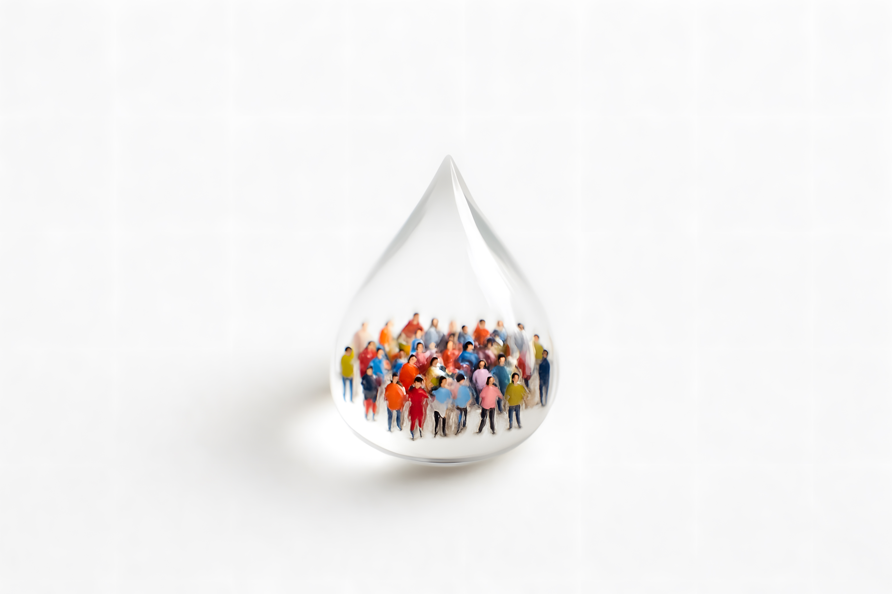 Das Bild zeigt eine Gruppe von stilisierten Menschenfiguren, die in einem kristallklaren Wassertropfen dargestellt sind. Diese minimalistische Darstellung symbolisiert die Idee von Zusammenhalt, Gemeinschaft und Vielfalt innerhalb einer Gesellschaft. Die Anordnung der bunten Figuren in der Tropfenform vermittelt ein Gefühl von Schutz, Geborgenheit und Verbundenheit.