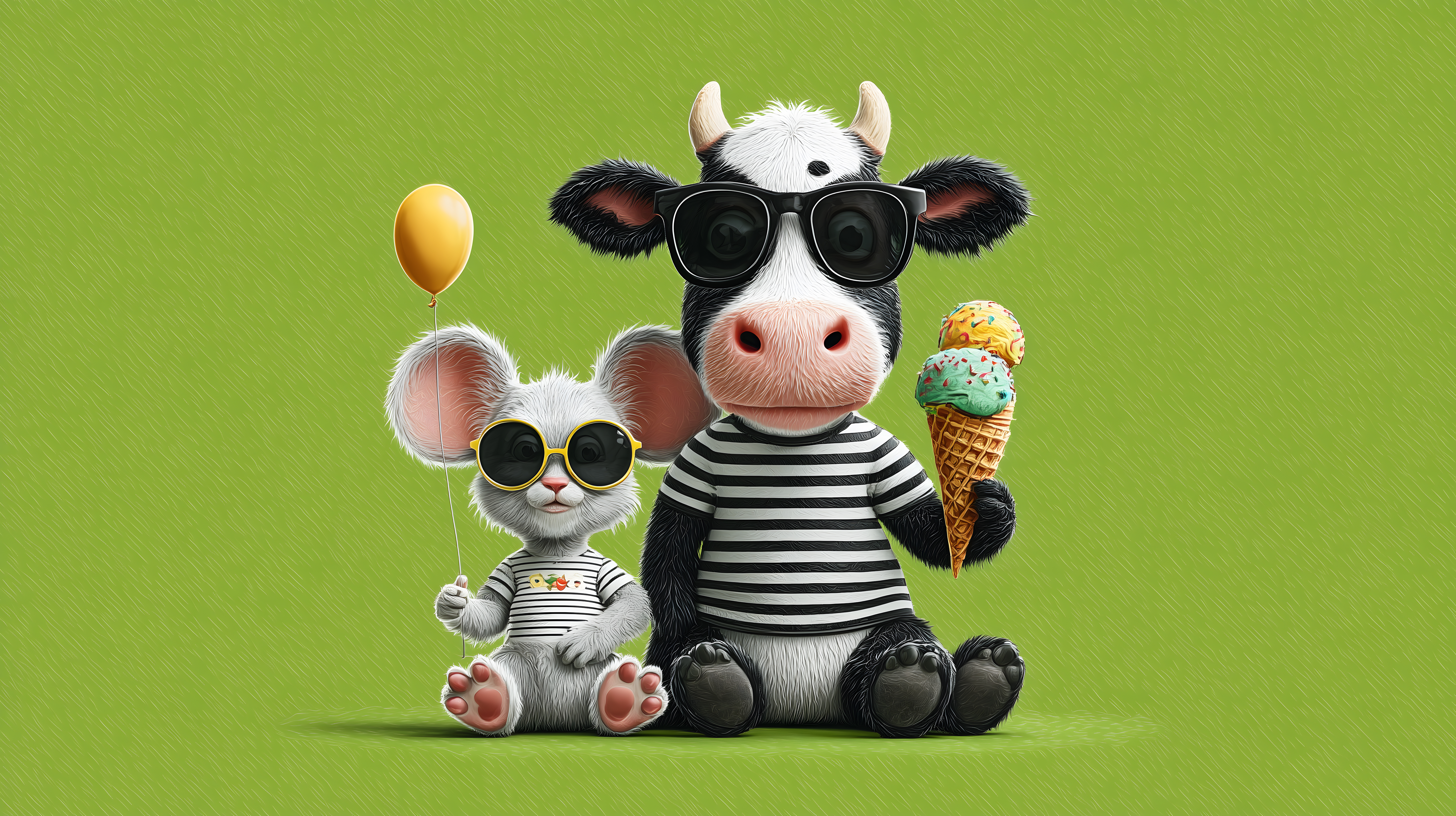 Dieses niedliche und lustige Stockfoto zeigt eine Kuh und eine Maus, die beide Sonnenbrillen tragen und vor einem leuchtend grünen Hintergrund sitzen. Die Kuh hält einen Luftballon und die Maus genießt ein leckeres Eis. Das Bild hat einen fröhlichen, cartoon-artigen Stil und eignet sich hervorragend für den Einsatz in Werbung, Social-Media-Kampagnen, Blogs oder anderen kreativen Projekten. Es ist in hoher Auflösung verfügbar und unter einer Creative-Commons-Lizenz kostenlos nutzbar.