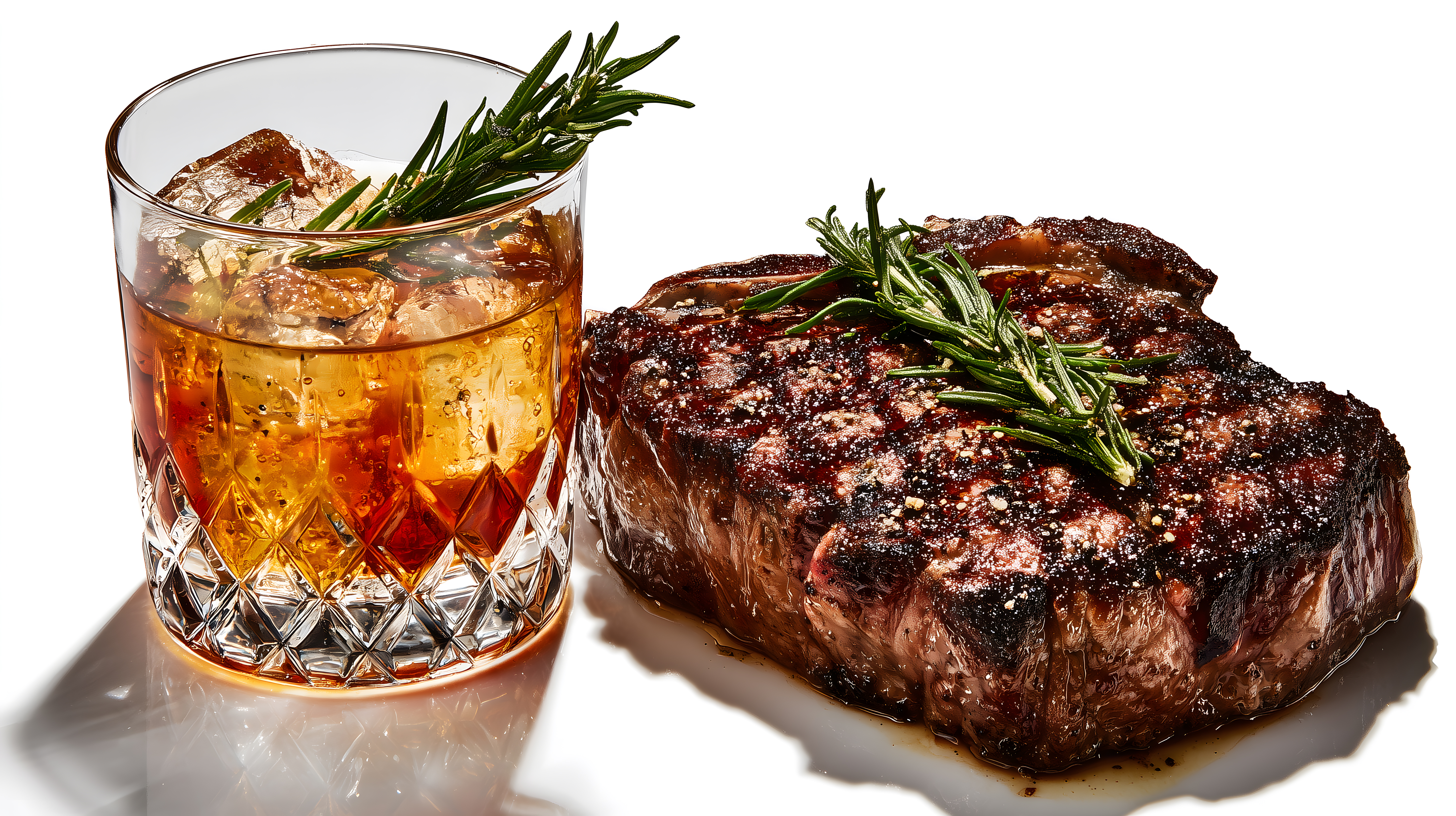 Das Bild zeigt ein leckeres, gegrilltes Steak, das mit Kräutern wie Rosmarin dekoriert ist. Neben dem Steak steht ein Whiskey-Cocktail in einem facettierten Kristallglas. Die Komposition und Farbgebung sind sehr appetitlich und laden zum Genuss ein. Dieses hochwertige Stockfoto eignet sich hervorragend für Websites, Magazine oder Social-Media-Posts rund um Themen wie Kulinarik, Gastronomie oder erlesene Genussmomente. Mit seiner hohen Auflösung und Creative-Commons-Lizenz ist es ein kostenloses, vielseitig einsetzbares Bild für Ihre Projekte.