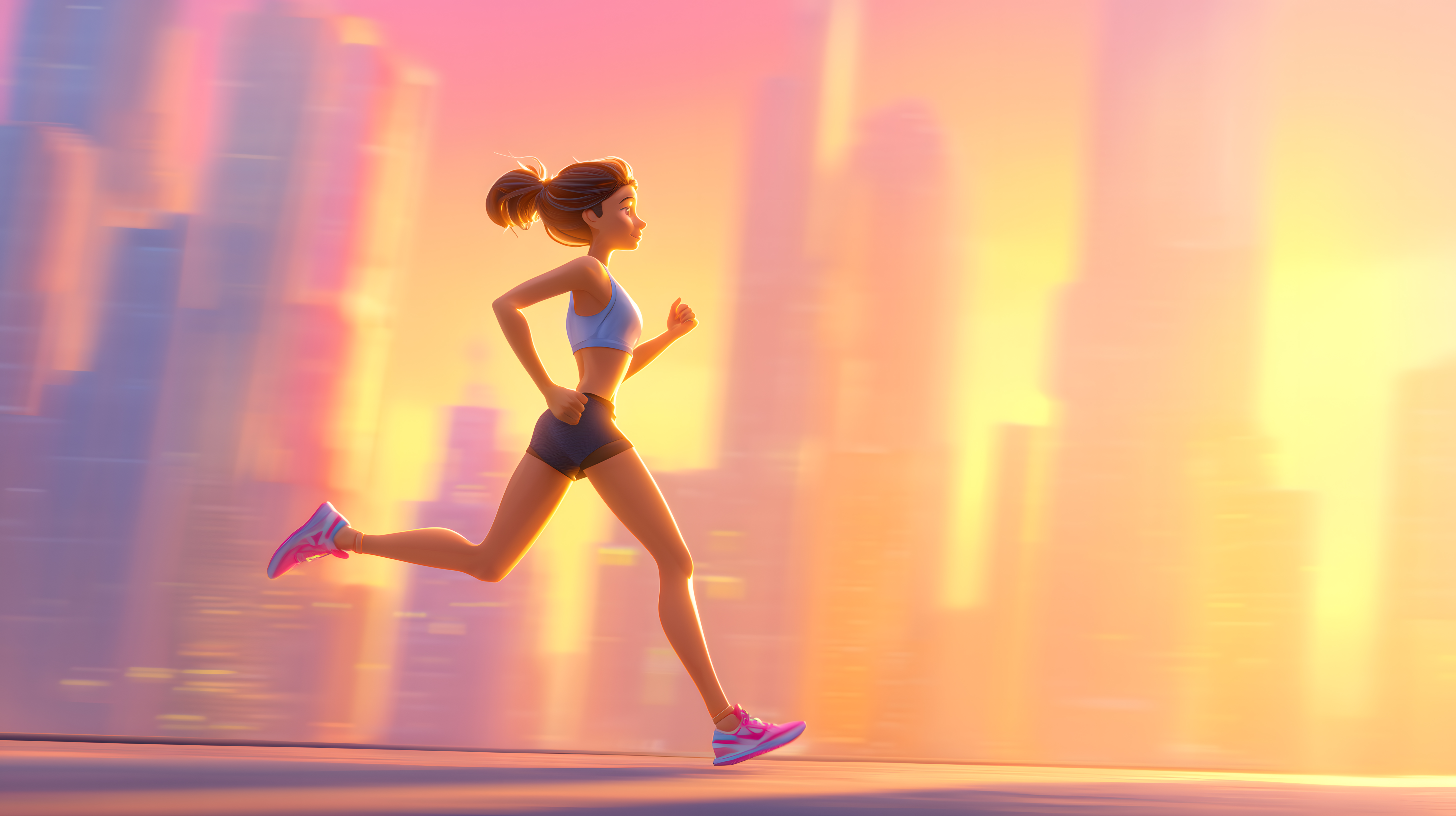 Das Bild zeigt eine animierte Läuferin, die vor einer farbenfrohen Stadtlandschaft läuft. Die Szenerie ist geprägt von warmen, leuchtenden Farben, die den Eindruck eines stimmungsvollen Sonnenuntergangs vermitteln. Die Läuferin, gekleidet in sportliche Shorts und ein Top, wirkt dynamisch und motiviert, wie sie über den Boden hinweg eilt. Das Bild könnte vielfältig eingesetzt werden, etwa in Blogs oder Social-Media-Posts rund um Sport, Fitness und Motivation. Als kostenloses Stockfoto in hoher Auflösung und unter Creative-Commons-Lizenz eignet es sich hervorragend für verschiedene Projekte.