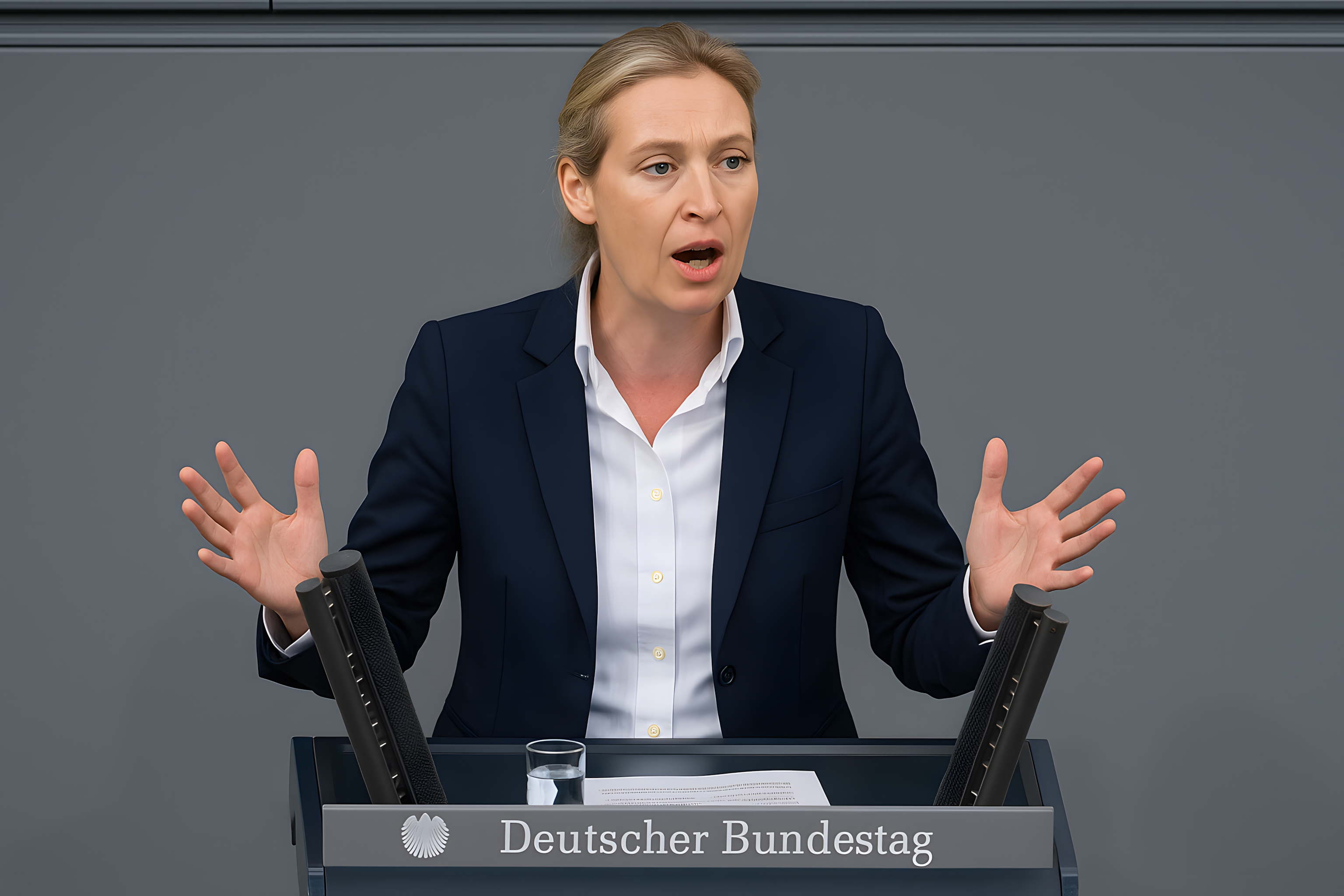 Das Bild zeigt eine Politikerin, die emotional eine Rede im Deutschen Bundestag hält. Sie steht hinter einem Rednerpult und gestikuliert mit ihren Händen, während sie spricht. Ihre Körpersprache ist offen und ausdrucksstark, was die Leidenschaft für ihr Thema widerzuspiegeln scheint. Die Politikerin trägt eine dunkle Jacke und ein weißes Hemd, was ihre professionelle Erscheinung betont. Der Hintergrund ist grau gehalten, was den Fokus auf die Rednerin lenkt. Dieses kostenlose, hochauflösende Stockfoto eignet sich hervorragend für Berichte, Artikel oder Werbematerialien rund um die deutsche Politik, Parlamentsdebatten und Führungsfiguren. Es steht unter einer Creative-Commons-Lizenz zur Verfügung.