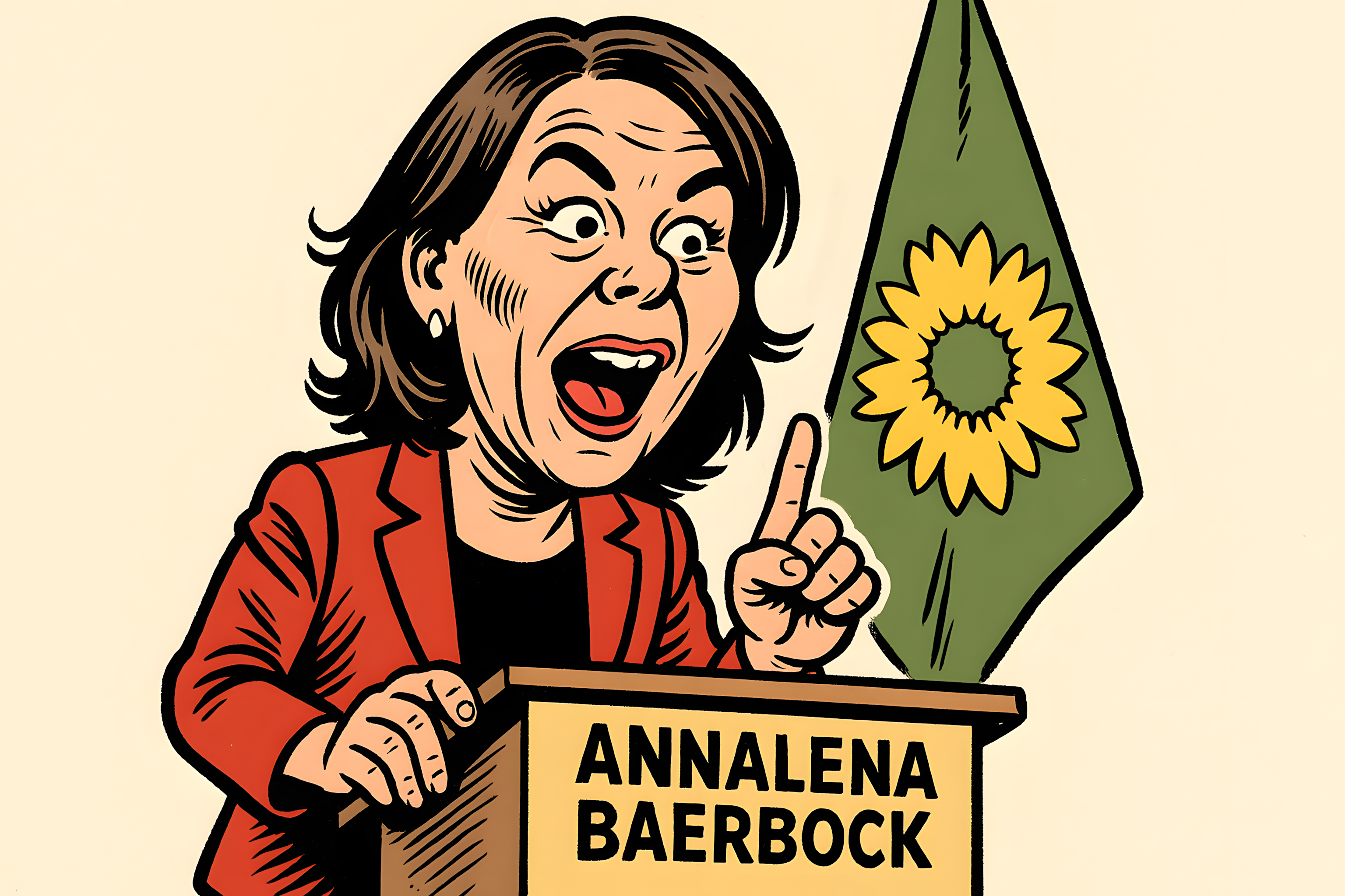 Dieses Stockfoto zeigt eine Karikatur einer politischen Rednerin, die an einem Rednerpult vor einer grünen Fahne mit Sonnenblumenmotiv steht. Der Ausdruck der Rednerin ist überrascht und lebhaft, ihre Hände sind zu einer Redegestik erhoben. Das Bild wurde im Comic-Stil illustriert und eignet sich gut für Themen aus den Bereichen Politik, Demokratie, Umweltschutz und Nachhaltigkeit. Das hochaufgelöste Foto steht unter einer Creative-Commons-Lizenz und kann kostenlos für Blog-Beiträge, Werbekampagnen in sozialen Medien oder Newsletter verwendet werden.