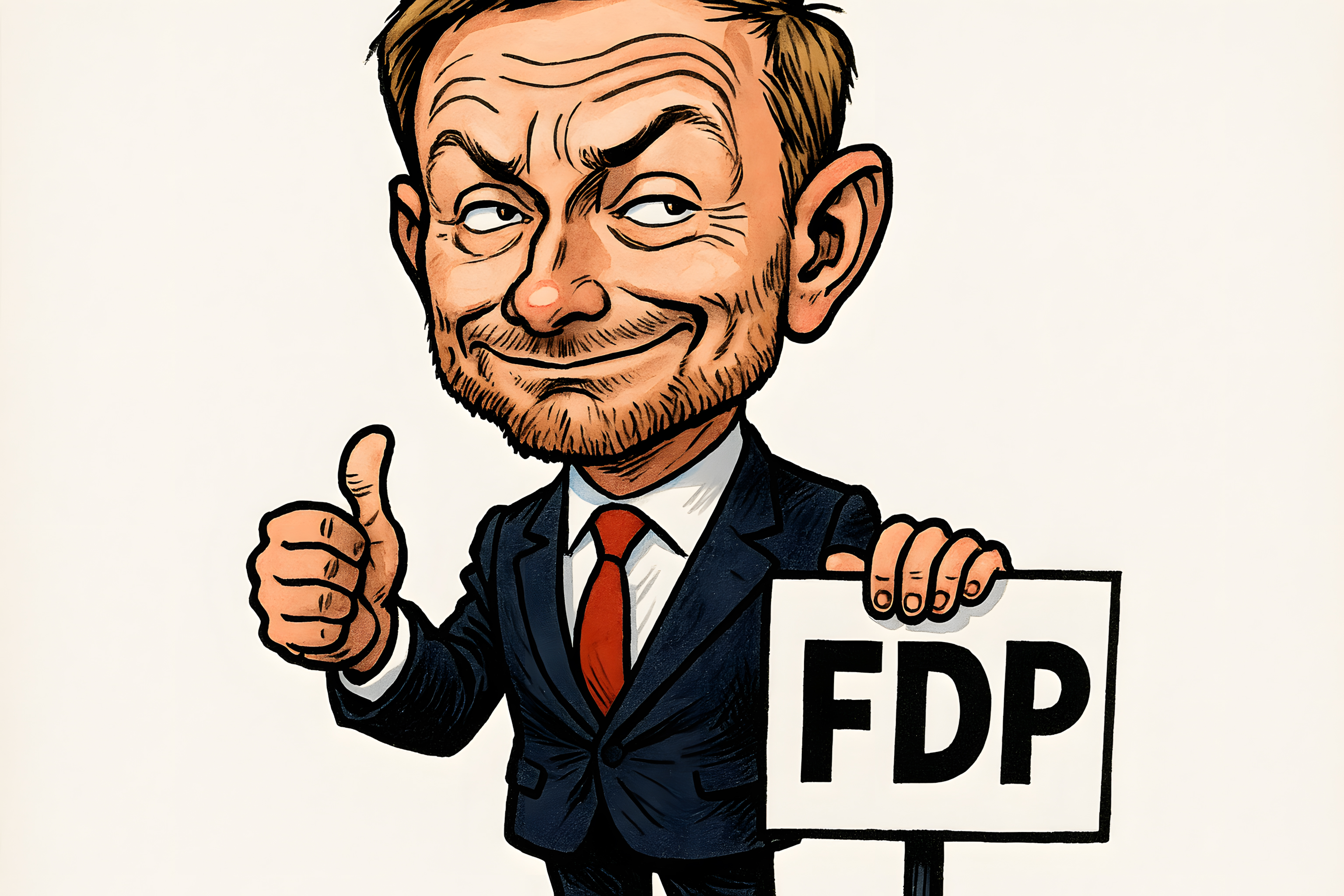 Dieses Bild zeigt eine farbenfrohe, überzeichnete Karikatur eines Mannes, der vermutlich der deutsche Politiker Christian Lindner von der FDP Partei darstellt. Er trägt einen dunklen Anzug mit roter Krawatte und hält ein Schild mit dem FDP-Logo in den Händen. Mit einem Daumen hoch signalisiert er Zustimmung oder Zufriedenheit. Der Comic-Zeichenstil verleiht der Darstellung eine satirische Note. Dieses Stockfoto eignet sich gut für Beiträge zu Themen wie Politik, Parteien, Werbung oder Karikaturen in hoher Bildqualität und unter Creative Commons-Lizenz.