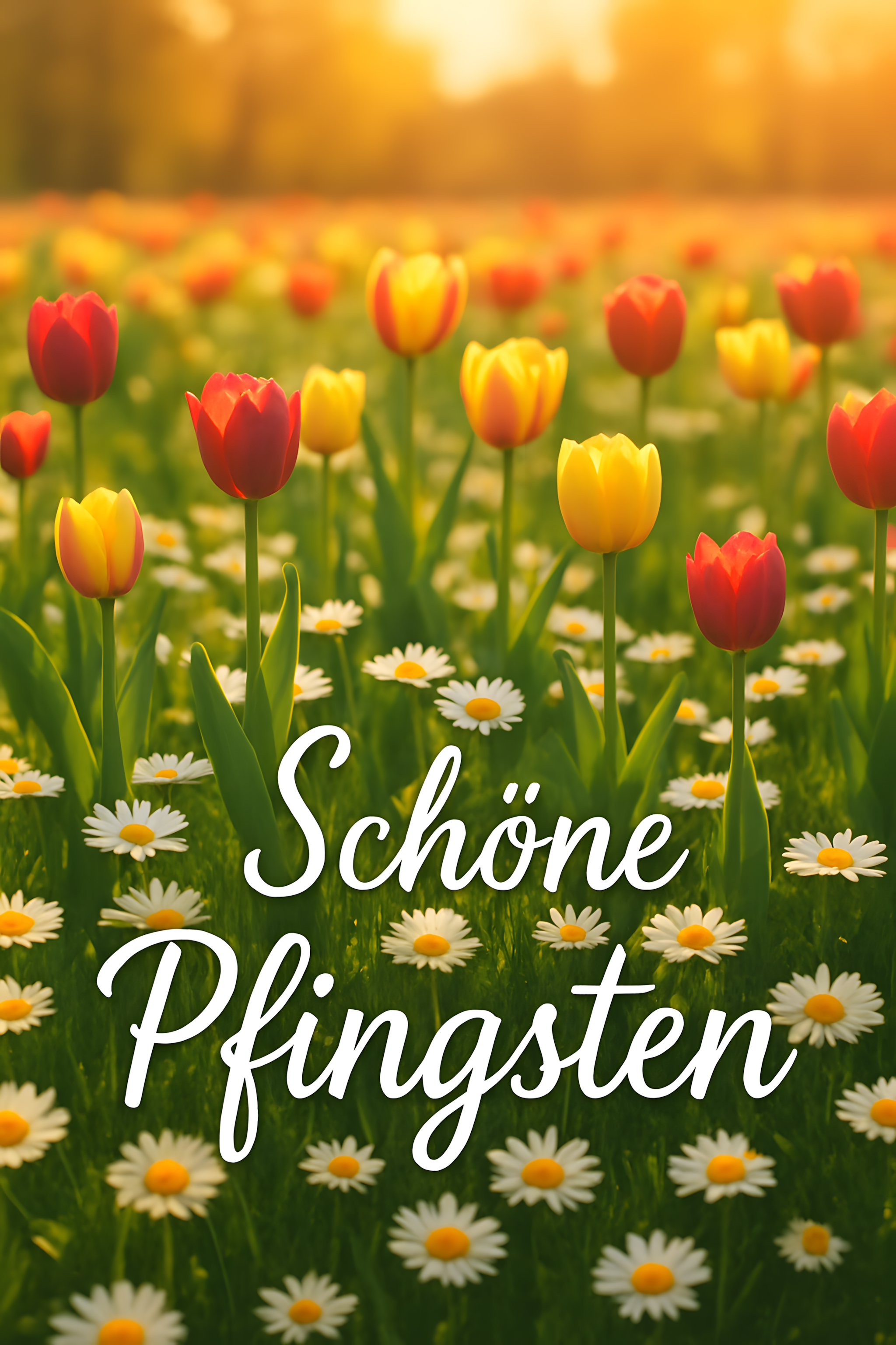 Das Foto zeigt eine wunderschöne Frühlingsszene mit einer bunten Blumenwiese voller leuchtender Tulpen und Gänseblümchen. Die Sonne strahlt golden über der Szenerie und taucht die Blüten in ein warmes, stimmungsvolles Licht. Die Komposition ist harmonisch und lädt zum Verweilen ein. Dieses natürliche Stockfoto in hoher Auflösung eignet sich hervorragend für die Verwendung in Blogs, Newslettern, sozialen Medien oder Werbematerialien rund um den Frühling, Osterfest oder Pfingsten. Das Bild steht unter einer kostenlosen Creative-Commons-Lizenz zur Verfügung.