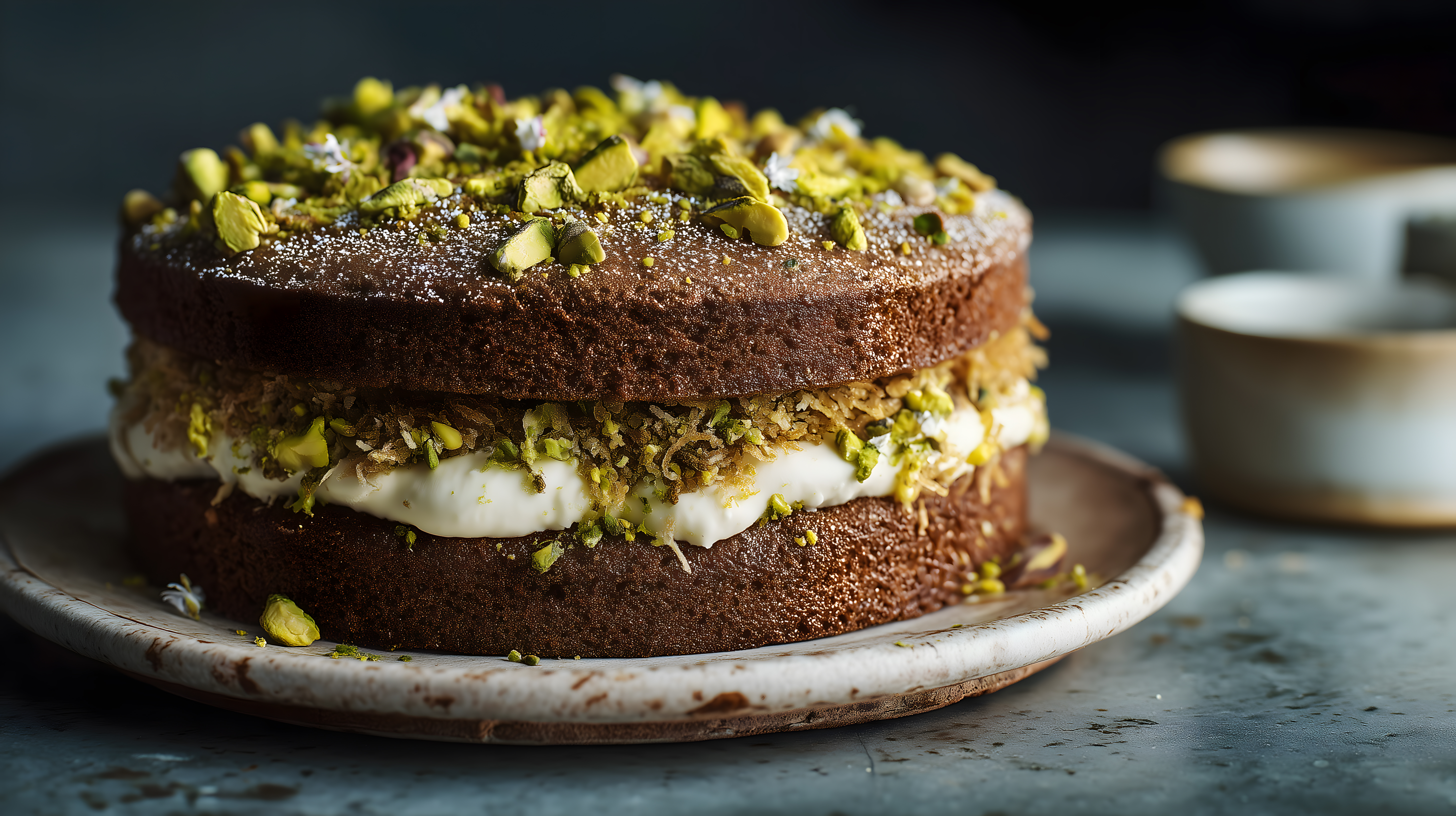 Dieses Foto zeigt einen leckeren Pistazien-Kuchen, der auf einem rustikalen Teller angerichtet ist. Der dunkle Kuchen ist mit einer cremigen, hellgrünen Füllung und gehackten Pistazien garniert, die einen dekorativen, appetitlichen Kontrast bilden. Das Bild besticht durch seine stimmungsvolle, dunkle Farbgebung und die natürliche, handwerkliche Anmutung des Kuchens. Dieses hochwertige Stockfoto eignet sich hervorragend für die Verwendung in Lebensmittelblogs, Rezeptportalen, Werbung für Patisserie-Angebote oder zur Gestaltung von Menü-Layouts in der Gastronomie. Mit seiner hohen Auflösung und Creative-Commons-Lizenz ist das Bild kostenlos für private und kommerzielle Zwecke nutzbar.