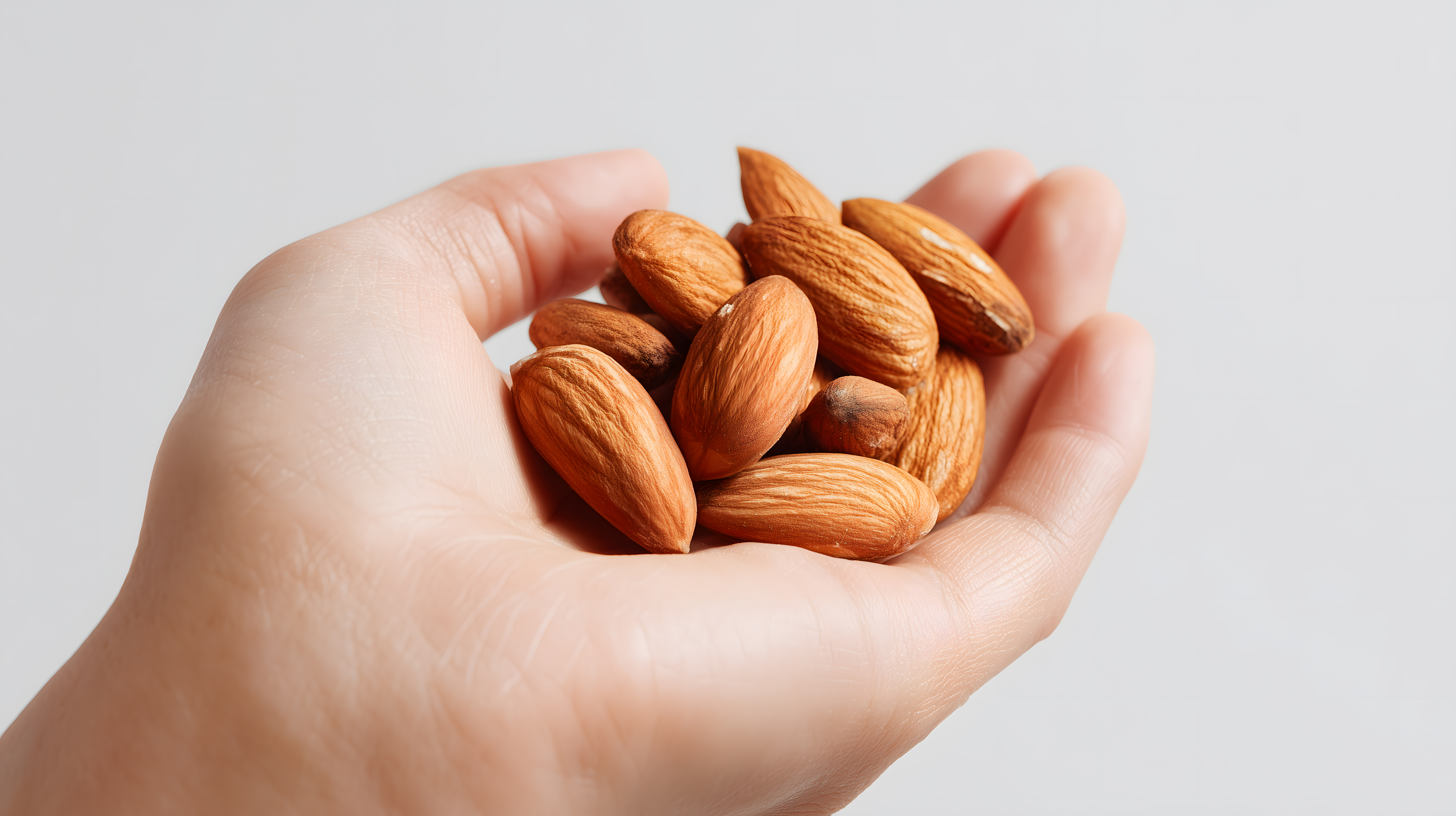 Das Bild zeigt eine Nahaufnahme von einer Handvoll frisch geernteter Mandeln auf einem weißen Hintergrund. Die ovalförmigen, goldbraunen Nüsse wurden in die offenen Hände eines Menschen gelegt, der sie präsentiert. Die Mandeln wirken knackig und natürlich, was den gesunden Charakter des Snacks unterstreicht. Dieses hochauflösende Stockfoto eignet sich ideal für die Verwendung in Blogs, Newslettern, Social-Media-Beiträgen oder Werbematerialien rund um die Themen Ernährung, Fitness und gesunde Lebensmittel. Es steht unter einer Creative-Commons-Lizenz zur kostenlosen Nutzung zur Verfügung.