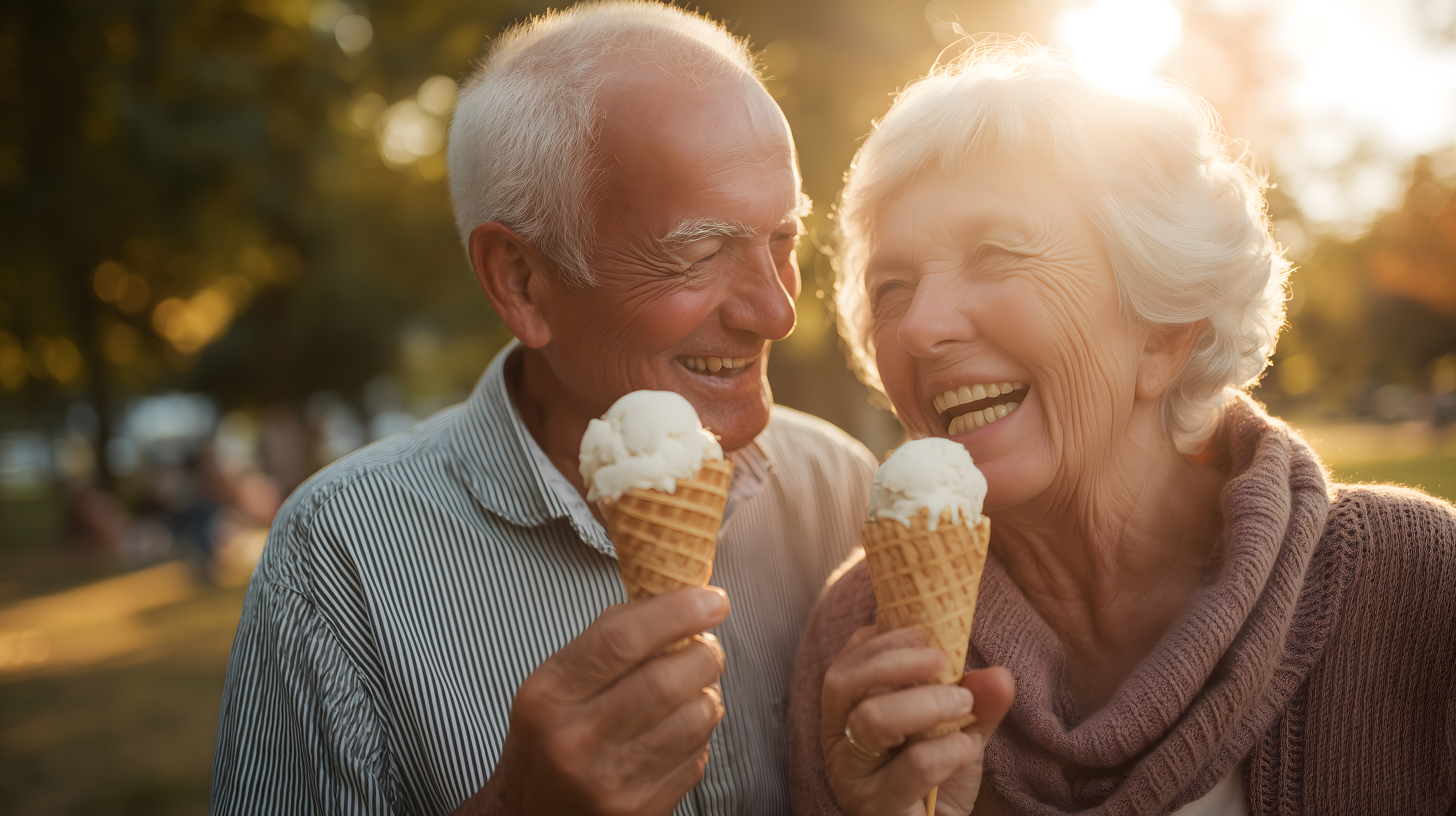 Das Bild zeigt ein glückliches älteres Paar, das Eis in einem sommerlichen Park genießt. Die beiden lachen und scheinen die Wärme und Sonne sichtlich zu genießen. Die Komposition mit den beiden Personen im Vordergrund und der weichen, warmen Beleuchtung im Hintergrund verleiht dem Foto eine positive, lebendige Atmosphäre. Dieses kostenlose Stockfoto in hoher Auflösung unter Creative-Commons-Lizenz eignet sich hervorragend für Blogbeiträge, Newsletter oder Social-Media-Posts rund um Themen wie Gesundheit im Alter, aktiver Ruhestand oder Freude am Leben.
