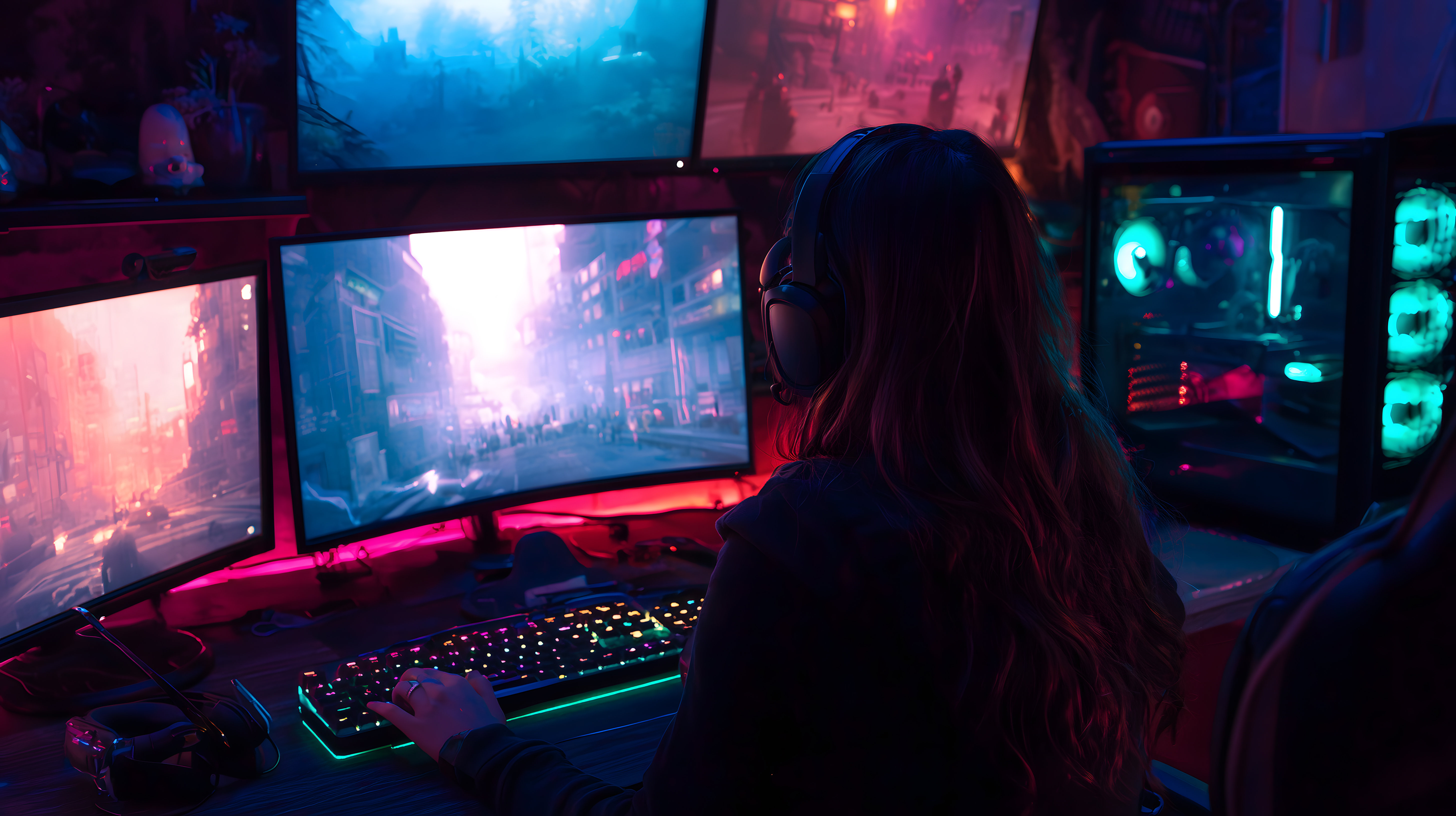 Dieses Foto zeigt eine Frau, die konzentriert an einem hochmodernen RGB-Gaming-Setup sitzt. Der dunkle Raum wird in ein mystisches Cyberpunk-Ambiente getaucht, das durch die Neonbeleuchtung der mehreren Computermonitore und der RGB-Beleuchtung der Hardware geschaffen wird. Die Gamerin ist in die virtuellen Welten auf den Bildschirmen versunken und scheint die reale Umgebung um sich herum komplett ausgeblendet zu haben. Dieses beeindruckende Stockfoto bietet sich perfekt für digitale Medien wie Blogs, Websites, Newsletter oder Social-Media-Kanäle an, die ein futuristisches, hochtechnologisches oder gaming-affines Flair vermitteln möchten. Es ist in hoher Auflösung und unter einer Creative-Commons-Lizenz verfügbar.