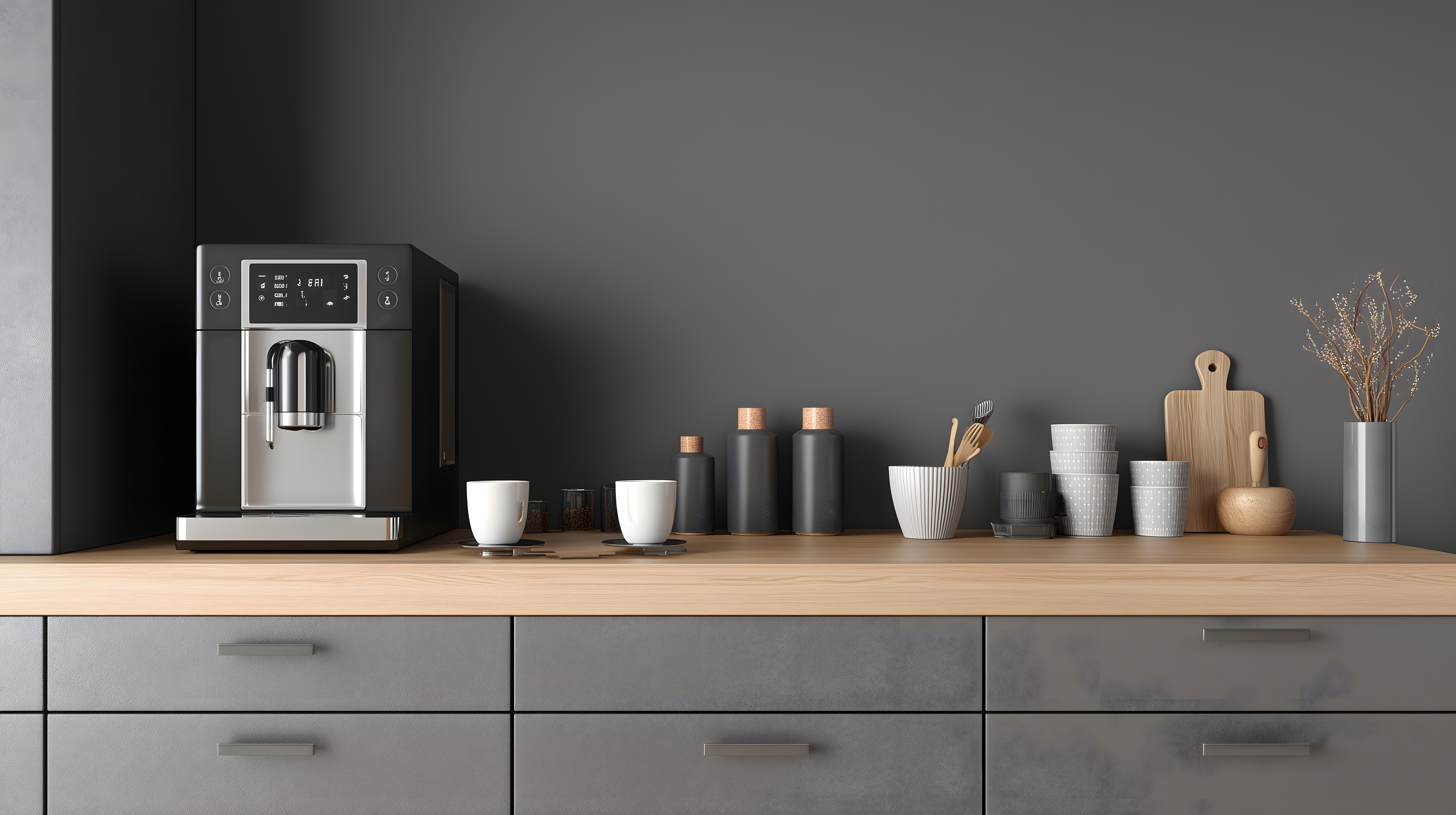 Das Foto zeigt eine moderne, minimalistische Küchendekoration. Im Mittelpunkt steht eine elegante Kaffeemaschine auf einer hellen Holzarbeitsplatte. Daneben sind verschiedene Küchenutensilien, Tassen, Schalen und Dekogegenstände wie Vasen und Blumen angeordnet. Die Farbgebung ist dezent in Grautönen gehalten, was dem Raum eine ruhige, gemütliche Atmosphäre verleiht. Das Bild eignet sich ideal als kostenloses Stockfoto für Blog-Beiträge, Newsletter oder Social-Media-Postings rund um das Thema Kaffee, Kochen und Küchen-Einrichtung in hoher Qualität und unter einer Creative-Commons-Lizenz.