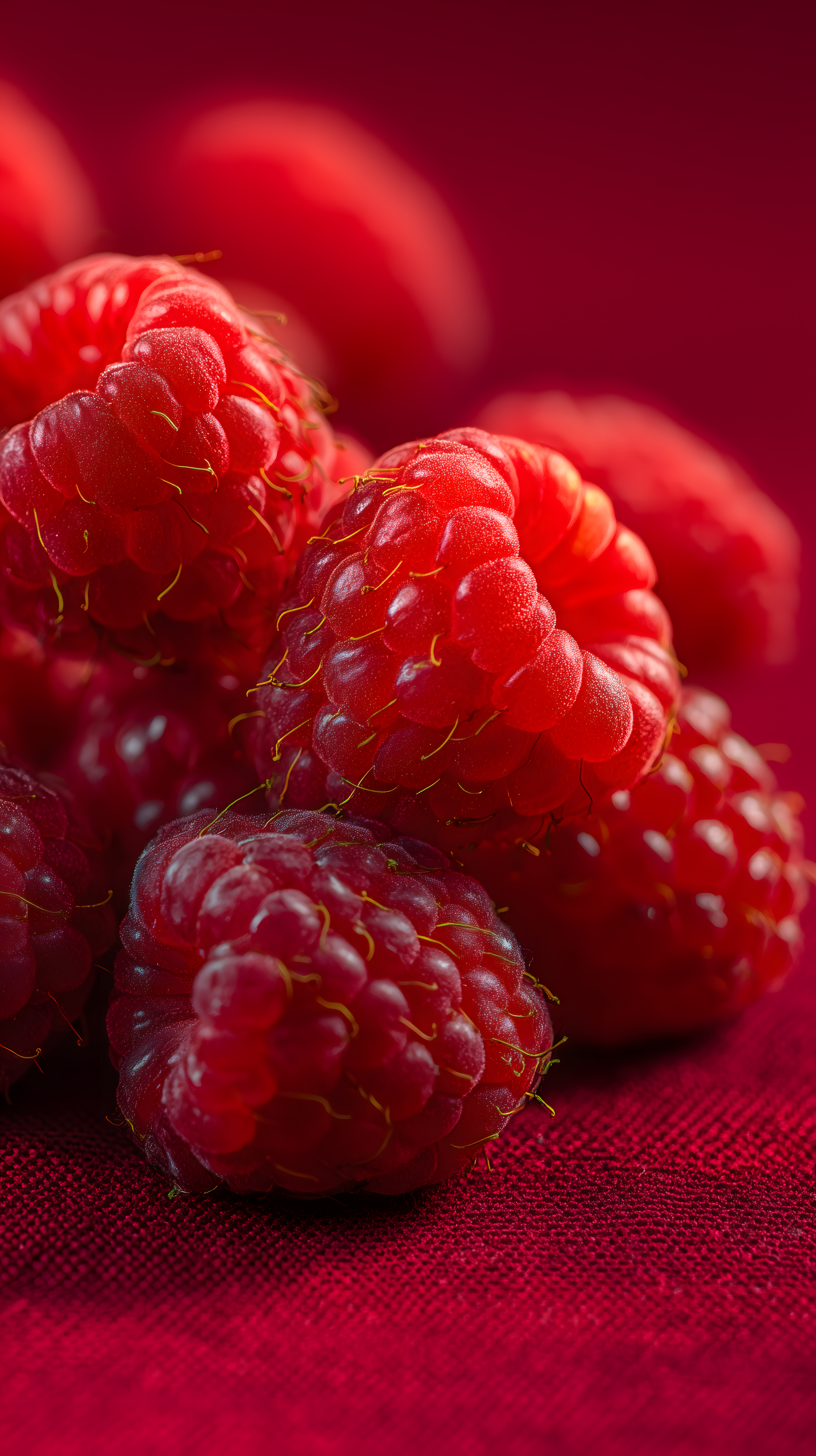 Dieses Foto zeigt eine enge Nahaufnahme von saftigen, reifen Himbeeren auf einer strukturierten, roten Oberfläche. Die Früchte glänzen leicht und die Details ihrer Textur sind deutlich sichtbar. Das intensive Rot der Beeren kontrastiert wunderschön mit dem dunklen Hintergrund, was eine stimmungsvolle, appetitanregende Atmosphäre schafft. Dieses hochauflösende Stockfoto eignet sich hervorragend für den Einsatz in Lebensmittelblogs, Rezeptsammlungen, Social-Media-Beiträgen oder Werbematerialien rund um Desserts, Getränke und gesunde Ernährung. Es steht unter einer Creative-Commons-Lizenz zur freien Verwendung zur Verfügung.