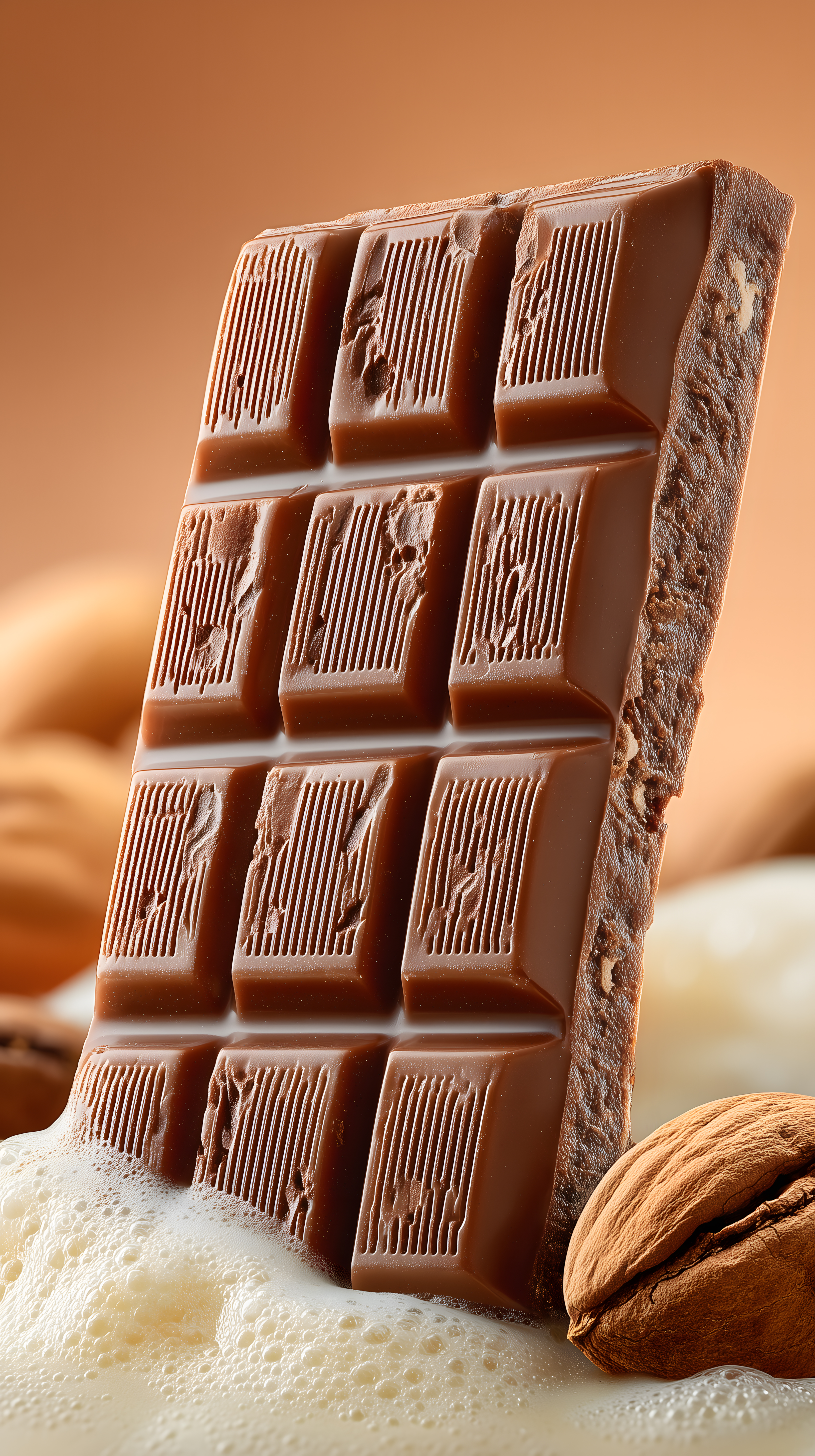 Dieses detailreiche Foto zeigt mehrere köstliche Schokoladenriegel mit einer charakteristischen Rillenstruktur auf der Oberfläche. Die Riegel sind auf einem hellen, rustikalen Hintergrund platziert, umgeben von gerösteten Mandeln und etwas Milchschaum. Die warmen Braun- und Orangetöne erzeugen eine appetitliche, sinnliche Atmosphäre.