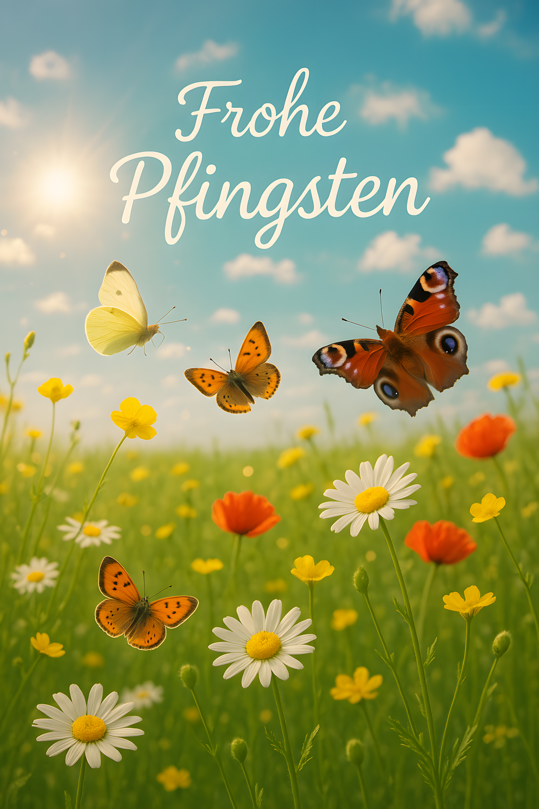 Dieses sonnige Frühlingsphoto zeigt eine bunte Blumenwiese mit vielen Schmetterlingen. Die Sonne scheint durch die Wolken, was einen warmen und hellen Effekt erzeugt. Verschiedene Schmetterlingsarten, darunter ein Tagpfauenauge und ein Zitronenfalter, flattern über den Gänseblümchen, Mohnblüten und anderen bunten Wildblumen. Das Bild strahlt Leichtigkeit, Ruhe und Natürlichkeit aus und eignet sich hervorragend als frühlingshafter Hintergrund für Websites, Social-Media-Posts, Newsletter oder Werbekampagnen rund um Ostern und Pfingsten. Als hochwertiges kostenloses Stockfoto unter Creative-Commons-Lizenz kann es für private und kommerzielle Zwecke genutzt werden.