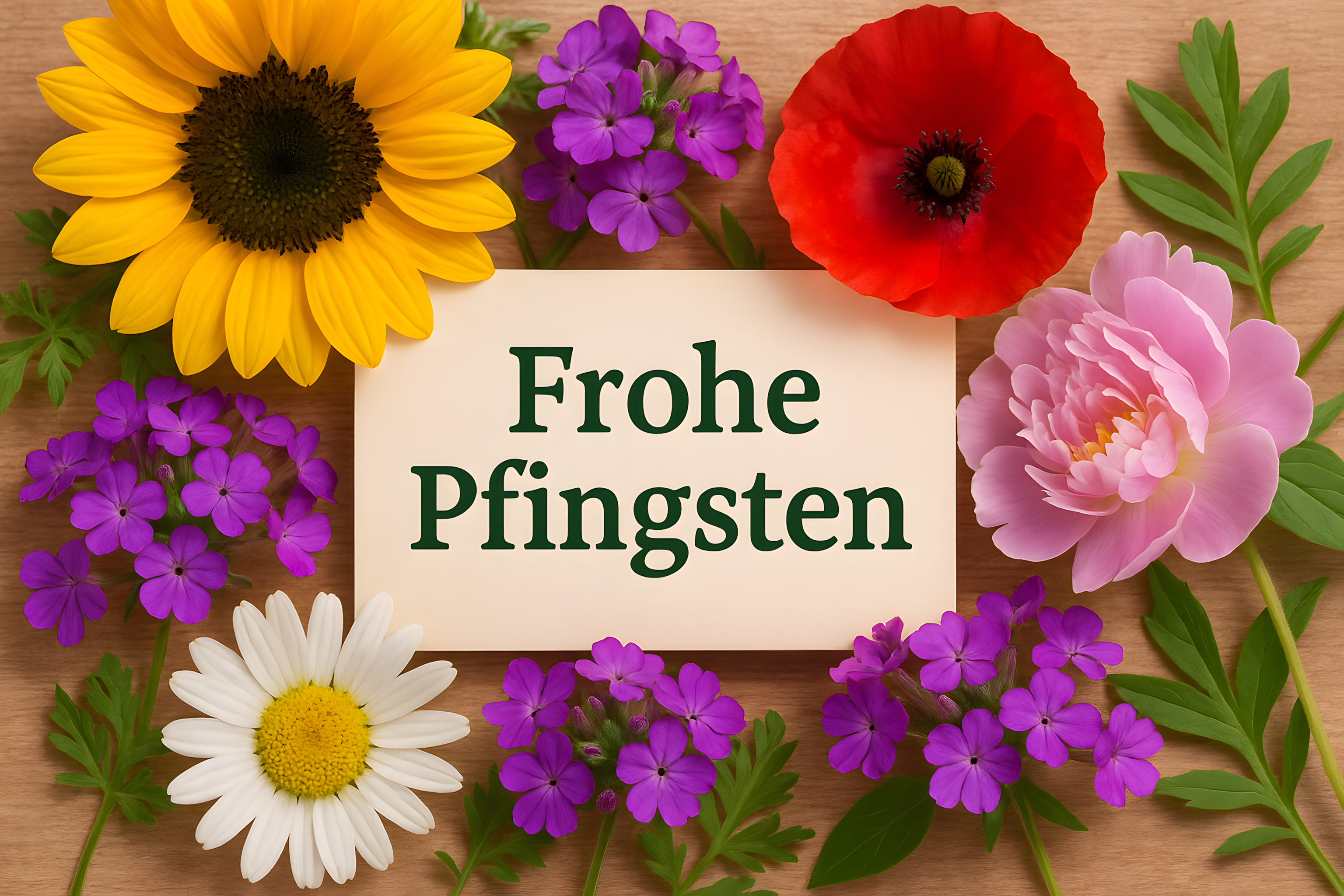 Das Foto zeigt eine bunte Blumenpracht auf einem Holztisch, die perfekt für eine Pfingstgrußkarte geeignet ist. Eine große gelbe Sonnenblume, rote Mohnblüten, violette Primelblüten und eine rosa Pfingstrose in einem rustikalen Ambiente aus Holz und grünen Blättern verleihen dem Motiv einen festlichen Charakter. Dieses hochauflösende Bild in Vintage-Optik eignet sich hervorragend für Blogs, Newsletter, Social-Media-Beiträge und Werbematerialien rund um das Pfingstfest. Als kostenloses Stockfoto unter Creative-Commons-Lizenz kann es kostenlos und frei genutzt werden.