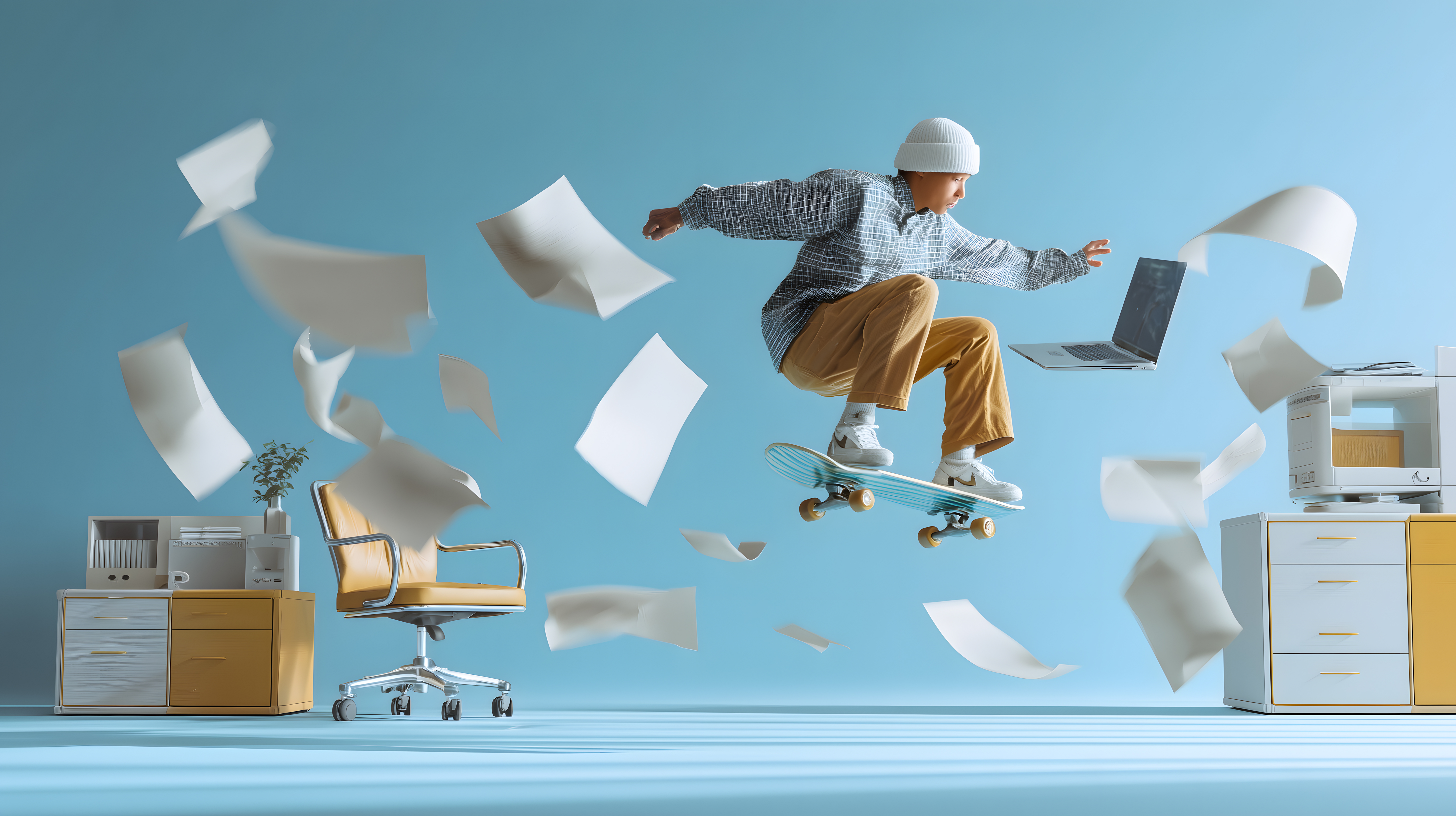Das Foto zeigt einen jungen, dynamischen Büroarbeiter, der auf seinem Skateboard durch den Raum schwebt und dabei einen Laptop in den Händen hält. Um ihn herum wirbeln Papierblätter durch die Luft, was eine Stimmung von Kreativität und Produktivität im Büroalltag vermittelt. Der Hintergrund ist in einem frischen Türkiston gehalten, was dem Bild eine moderne und freie Atmosphäre verleiht. Dieses Stockfoto eignet sich ideal für Blogbeiträge, Newsletter oder Social-Media-Posts rund um Themen wie Digitalisierung, Startup-Kultur, innovative Arbeitsumgebungen oder unkonventionelle Bürokonzepte. Die hochauflösende Datei ist unter einer Creative-Commons-Lizenz frei nutzbar.