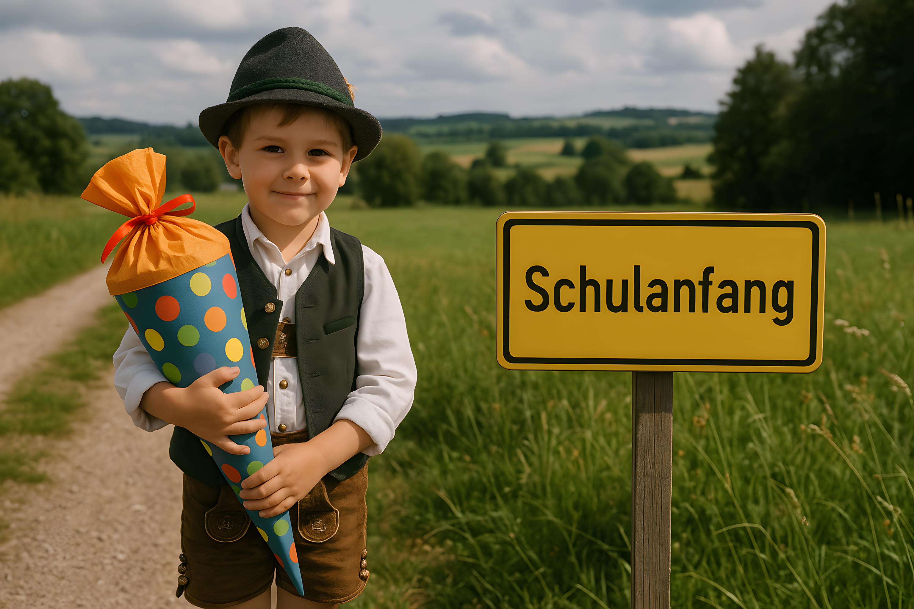 Das Bild zeigt einen jungen Jungen, der in ländlicher Umgebung vor einem Ortsschild mit der Aufschrift 'Schulanfang' steht. Er trägt eine bunte, gemusterte Schultüte und sieht glücklich und aufgeregt aus - offensichtlich freut er sich auf seinen ersten Schultag. Die Szene ist in einer idyllischen Landschaft mit Wiesen, Feldern und Wäldern im Hintergrund aufgenommen, was den ländlichen Charakter der Aufnahme unterstreicht. Dieses kostenlose Stockfoto in hoher Auflösung unter Creative-Commons-Lizenz eignet sich hervorragend für Blogs, Newsletter, Social-Media-Beiträge oder Werbematerialien rund um den Schulstart, die Kindheit und Bildungsthemen.