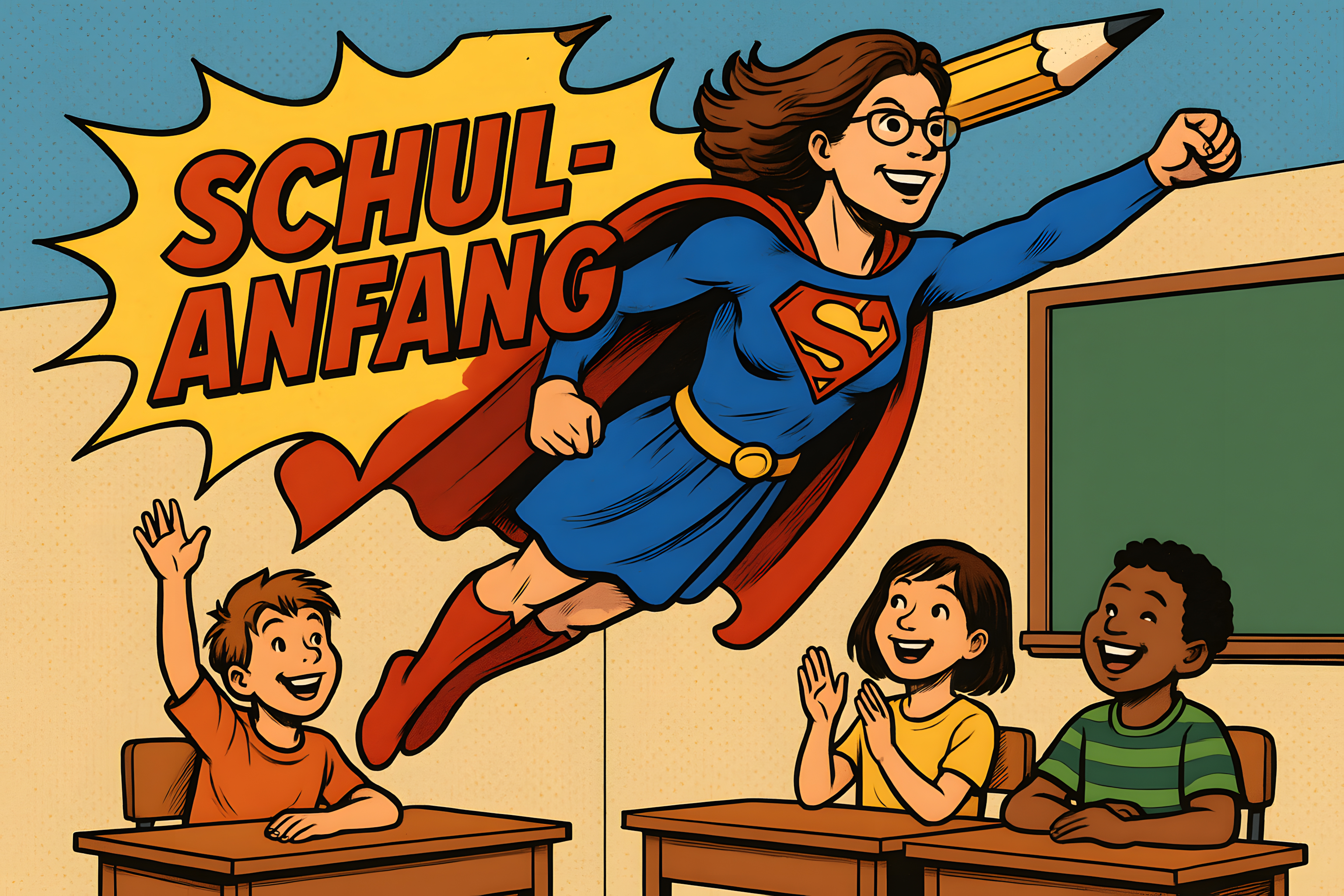 Das Bild zeigt einen Lehrer, der als Superheld verkleidet ist und über ein Klassenzimmer fliegt. Die Schüler sitzen an ihren Tischen und schauen begeistert zu ihm auf. Der Superheld-Lehrer streckt einen Bleistift wie einen Zauberstab aus und scheint die Schüler zu inspirieren und zu motivieren. Der Comic-Stil und die kräftigen Farben verleihen der Szene eine dynamische und fröhliche Atmosphäre. Dieses Stockfoto eignet sich hervorragend für Artikel, Blogbeiträge oder Social-Media-Posts rund um Themen wie Bildung, Kreativität, Lernmotivation und die positive Rolle von Lehrern. Es ist in hoher Auflösung und unter einer Creative-Commons-Lizenz verfügbar.