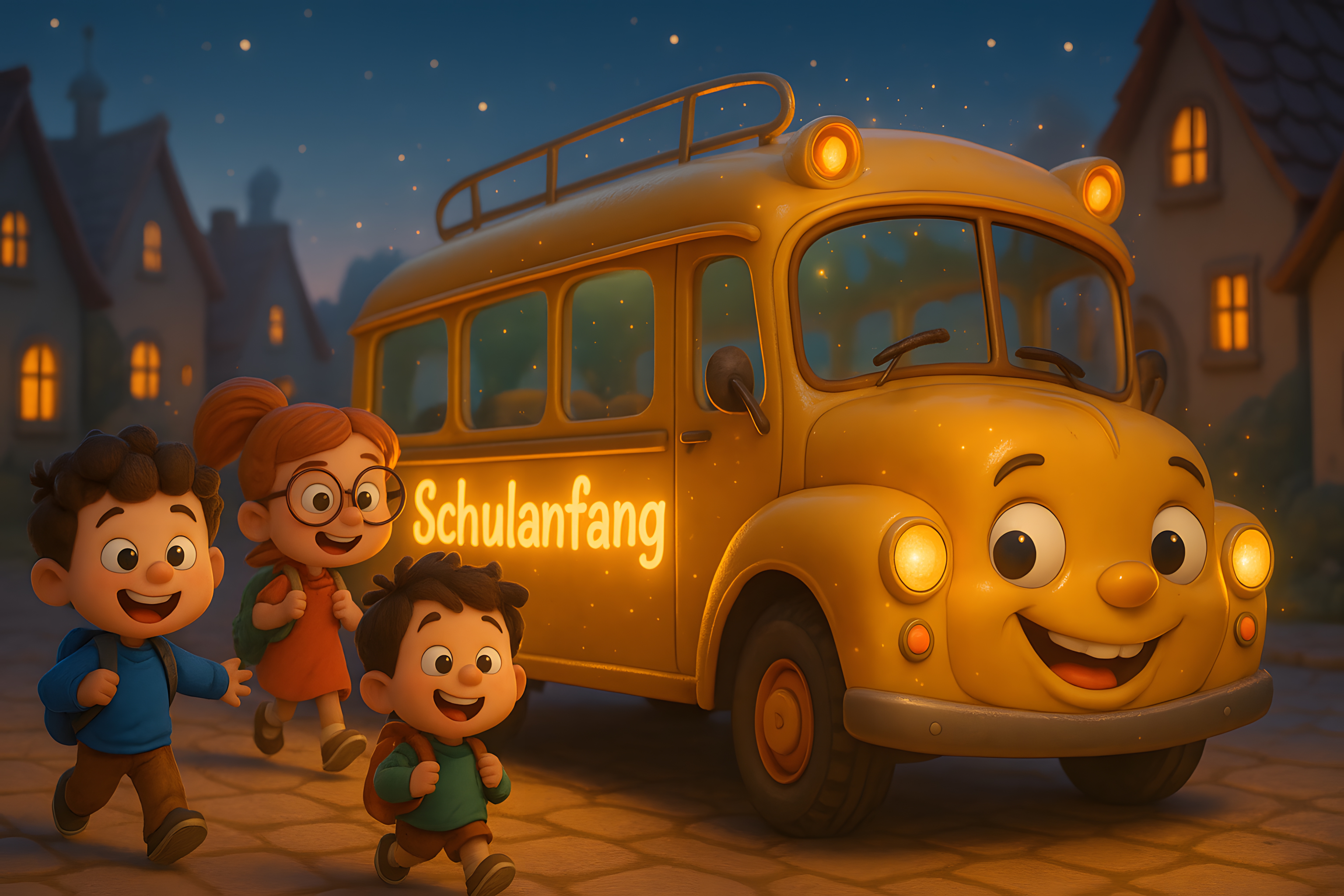Dieses farbenfrohe Bild zeigt einen leuchtend gelben Schulbus, der von glücklichen Kindern umgeben ist. Nachts fährt der Bus durch eine pittoreske Straßenszene, vorbei an erleuchteten Häusern und einem sternenklaren Himmel. Die Kinder rennen freudig neben dem Bus her, ihre Gesichter voller Vorfreude auf den Schulanfang. Das Bild strahlt eine freundliche, unbeschwerte Atmosphäre aus und eignet sich hervorragend als kostenloses Stockfoto für Bildungskampagnen, Kinderseiten oder Werbung mit familienfreundlichem Charakter. Die hohe Auflösung und Creative-Commons-Lizenz erlauben eine flexible Verwendung in verschiedensten Kontexten.