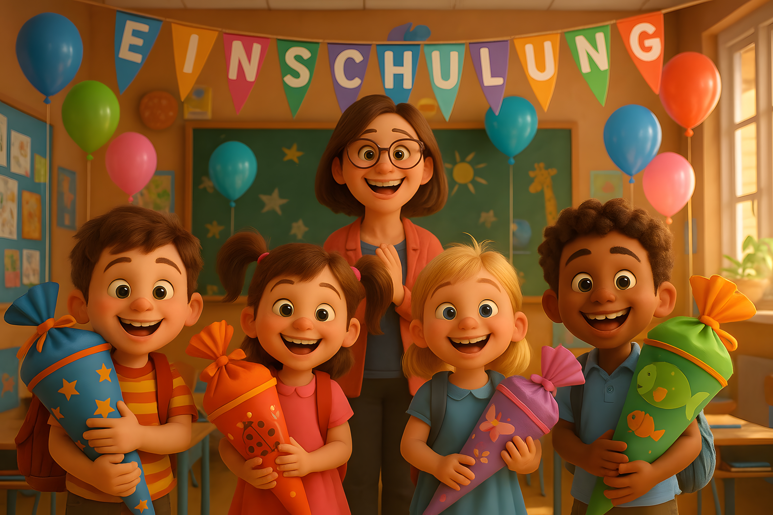 Diese fröhliche Illustration zeigt eine Einschulungsfeier in einem bunten Klassenzimmer. Die Lehrerin und vier Schüler stehen lächelnd zusammen, umgeben von Luftballons, Schultüten und einer 'Einschulung'-Dekoration. Die detailreiche Szene vermittelt eine positive, aufgeregte Stimmung, wie sie am ersten Schultag oft herrscht. Dieses kostenlose Stockfoto in hoher Auflösung unter Creative-Commons-Lizenz eignet sich hervorragend für Blogbeiträge, Newsletter, Social-Media-Posts oder andere Marketingmaterialien rund um das Thema Schule, Bildung und den Beginn eines neuen Schuljahres.