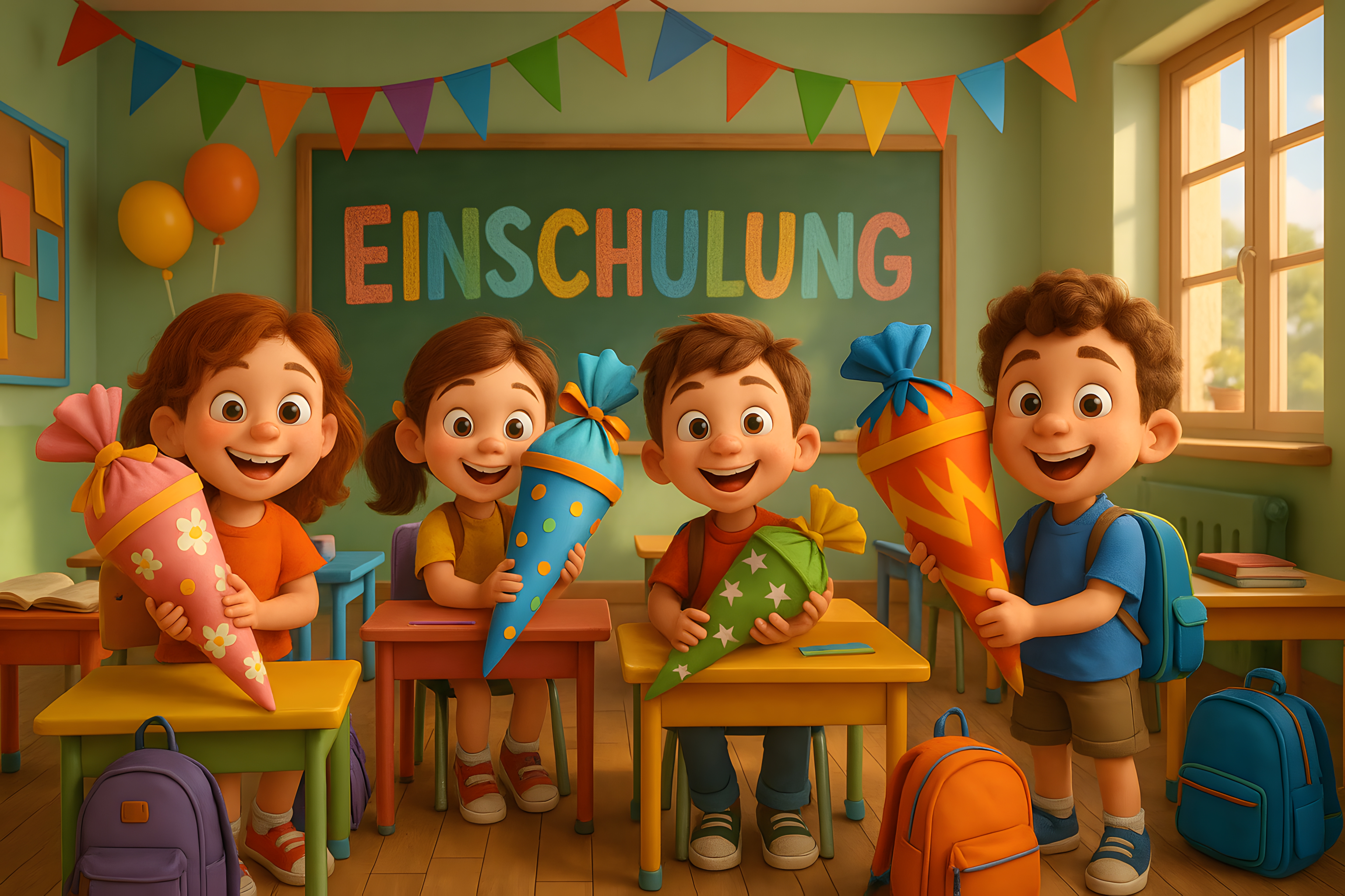 Dieses farbenfrohe Bild zeigt eine fröhliche Einschulungsfeier in einem Klassenzimmer. Vier lächelnde Kinder sitzen an Tischen und halten bunte Schultüten in den Händen, die typisch für den Schulstart in Deutschland sind. An den Wänden hängen Girlanden und Luftballons, die eine feierliche Atmosphäre schaffen. Der Raum ist hell und freundlich gestaltet, was eine angenehme Lernumgebung für die Kinder vermittelt. Dieses Foto eignet sich hervorragend für den Einsatz in Artikeln, Newslettern oder Social-Media-Beiträgen rund um das Thema Einschulung, Schuleintritt oder den Schulalltag. Als hochauflösendes Stockfoto unter einer Creative-Commons-Lizenz ist es kostenlos für viele Zwecke verwendbar.
