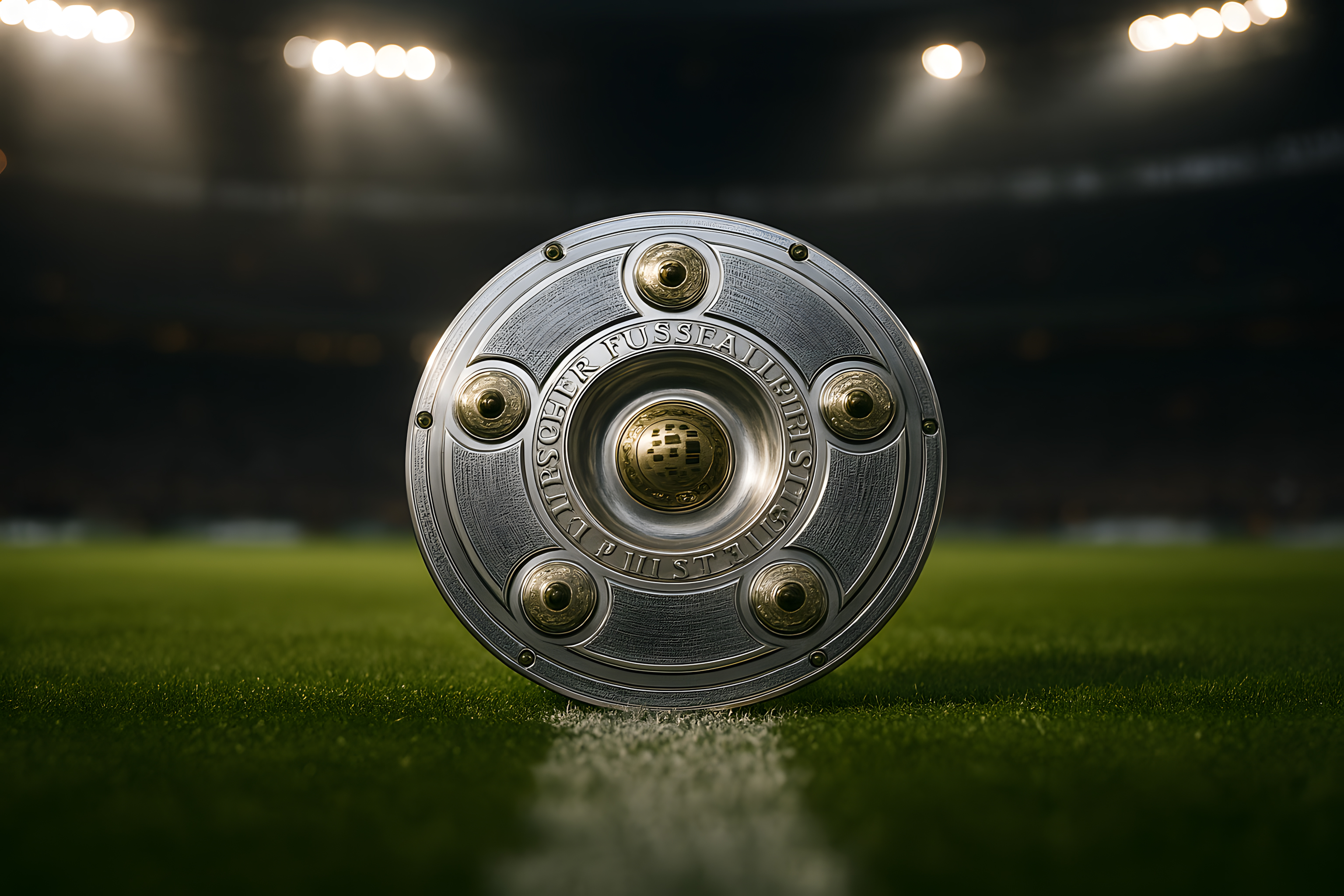 Das Bild zeigt die deutsche Meisterschale auf einem Fußballfeld bei Nacht, beleuchtet von Flutlichtstrahlern. Die silberne Trophäe mit dem goldenen Emblem steht im Mittelpunkt und symbolisiert den Gewinn der Deutschen Fußballmeisterschaft. Das dunkle Spielfeld im Hintergrund, umrahmt von den Scheinwerfern, verleiht der Szene eine feierliche und emotionale Atmosphäre. Dieses Stockfoto ist perfekt für die Verwendung in Artikeln, Blogs oder sozialen Medien rund um den Deutschen Fußball, Fußballvereine, Meisterschaften und Pokalsiege. Es ist in hoher Auflösung und unter einer Creative-Commons-Lizenz verfügbar.