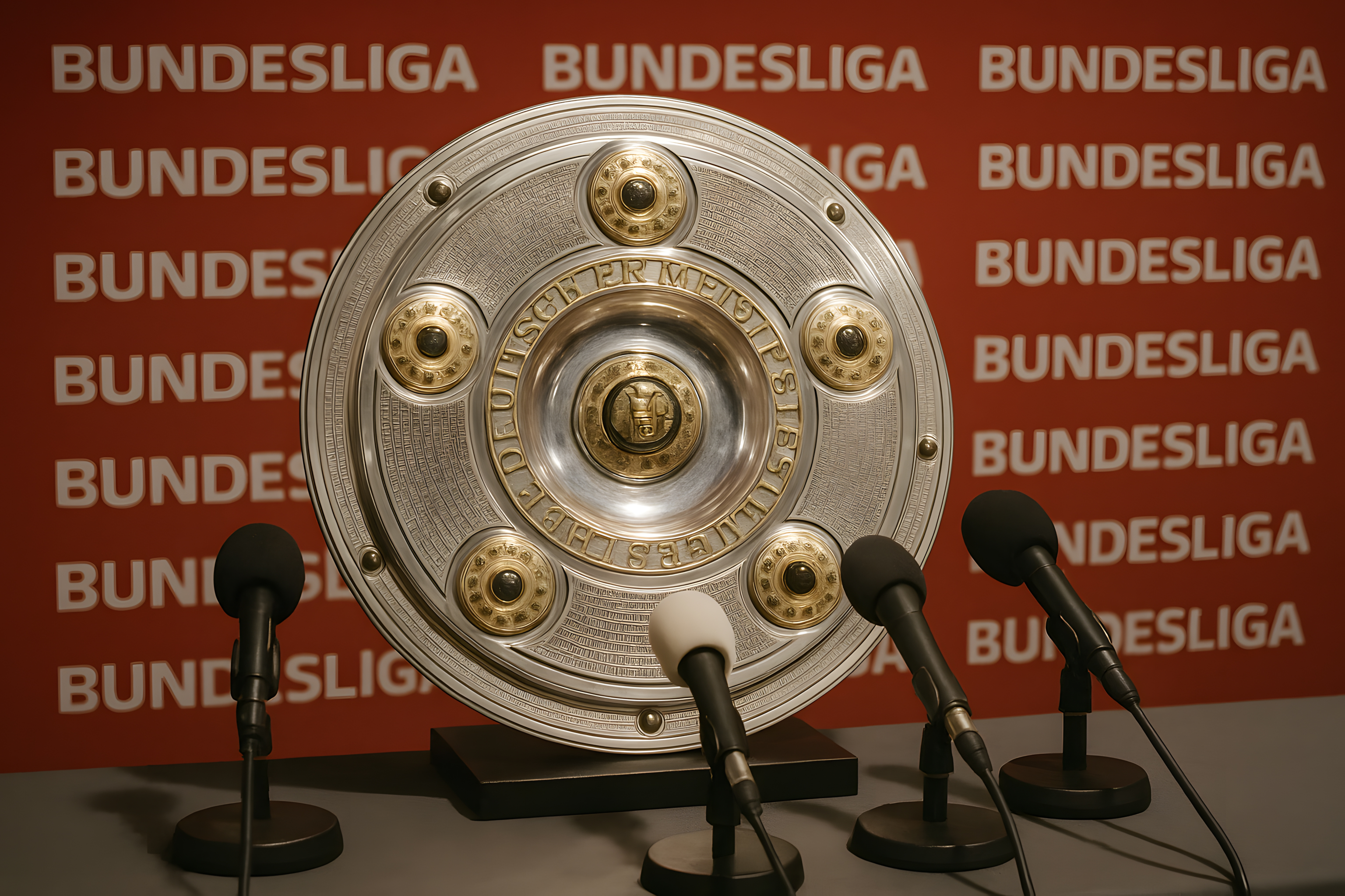 Das Foto zeigt die Meisterschale der deutschen Bundesliga, die traditionell bei Pressekonferenzen nach Meisterschaftsentscheidungen präsentiert wird. Die massive Trophäe ist aus Silber und mit goldenen Details verziert und steht auf einer Bühne, die mit Bundesliga-Bannern dekoriert ist. Vor der Schale sind mehrere Mikrofone aufgebaut, was die Kulisse für eine offizielle Pressekonferenz komplett macht.