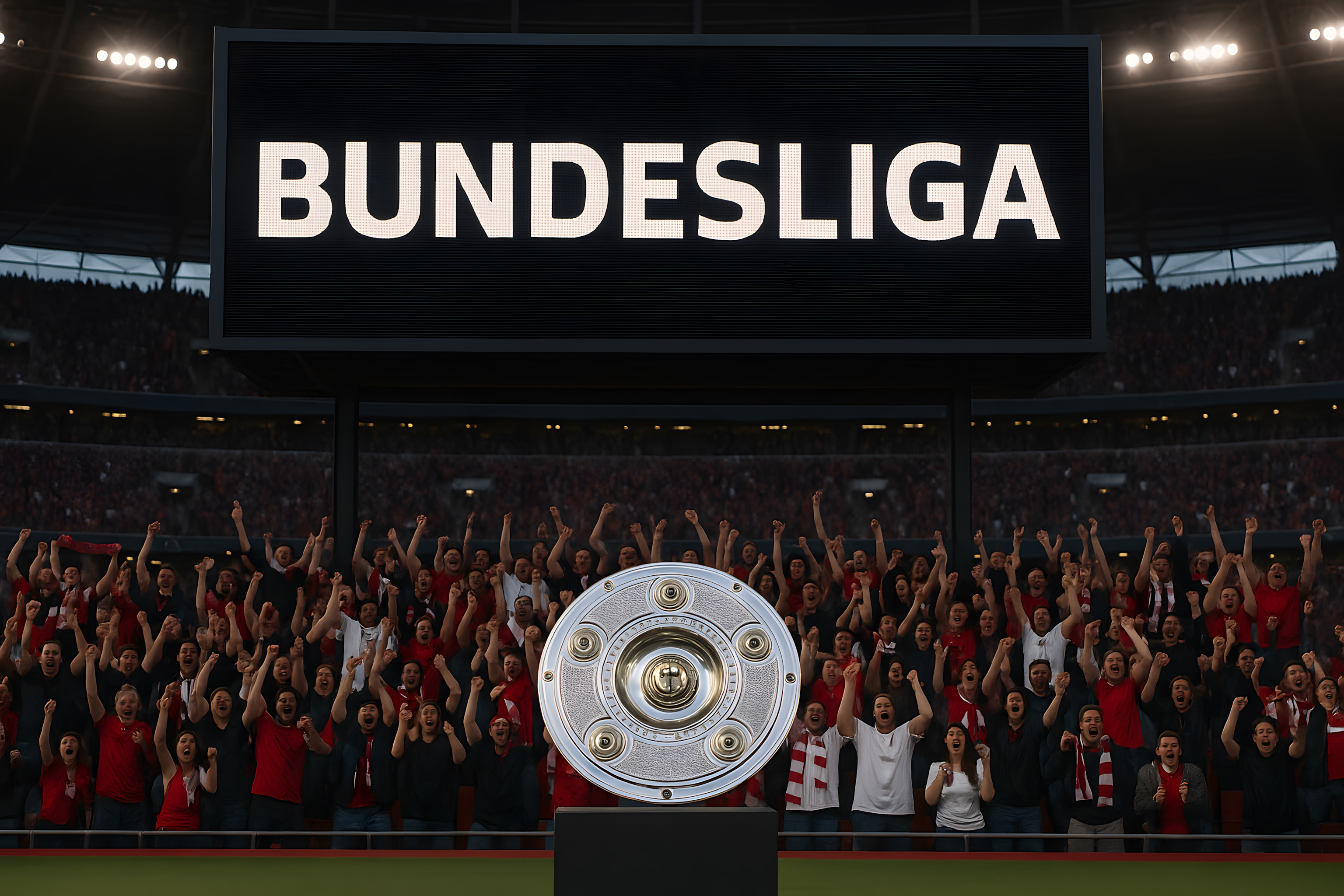 Das Bild zeigt eine Bundesliga-Meisterfeier im Stadion vor jubelnden Fans. Im Vordergrund ist die Meisterschale zu sehen, umgeben von einer begeisterten Menschenmenge, die ihre Arme in die Luft reckt. Im Hintergrund ist die große Stadionanzeige mit dem Schriftzug 'BUNDESLIGA' zu erkennen. Das Foto vermittelt die Atmosphäre und den Enthusiasmus einer solchen Titelfeier und eignet sich hervorragend als kostenloses Stockfoto in hoher Auflösung für Beiträge in Blogs, Newslettern, Social-Media-Kanälen oder Werbematerialien zum Thema Fußball, Sport und Erfolg. Die Lizenz ist Creative Commons, sodass das Bild frei verwendet werden kann.