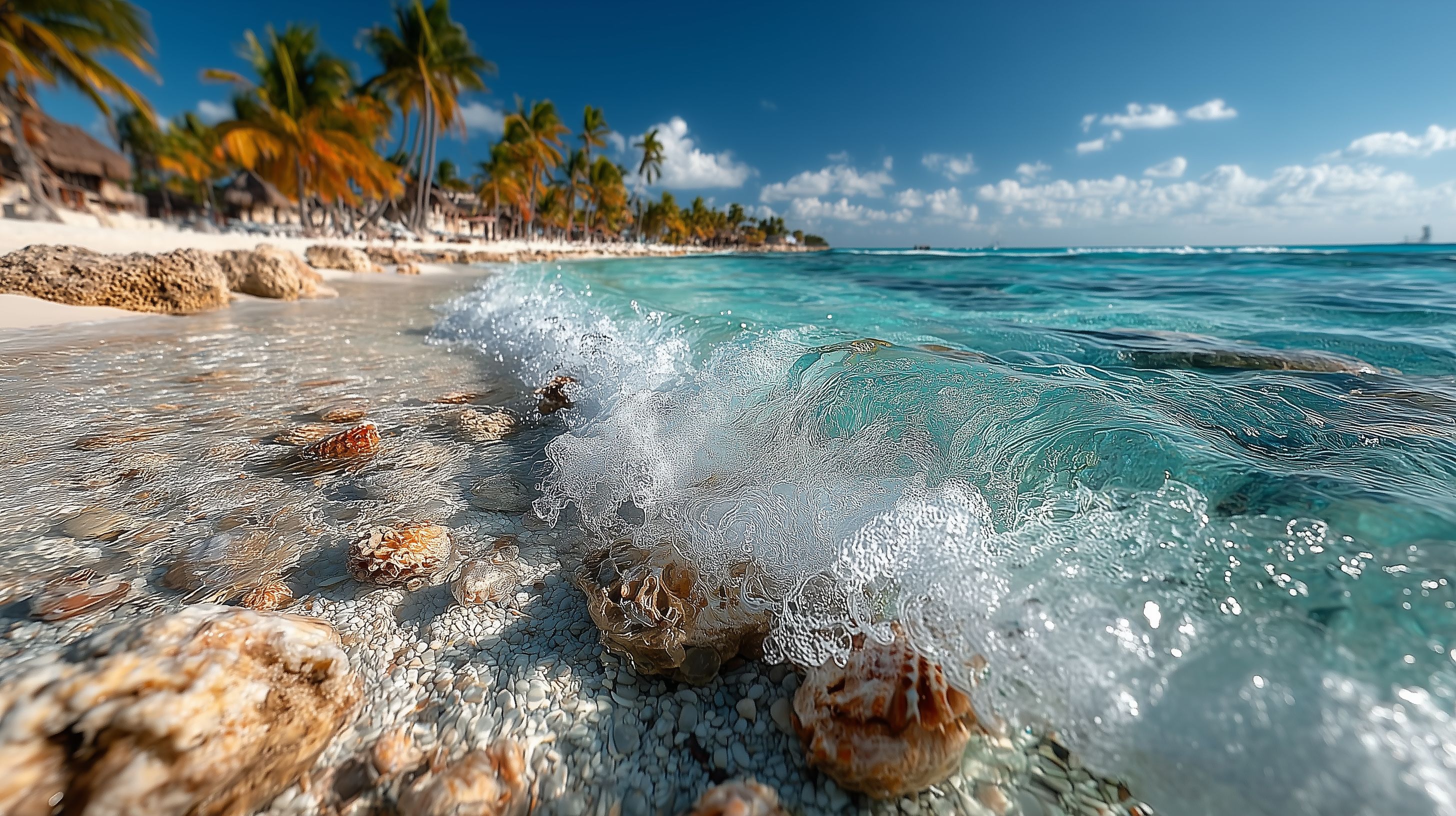 Dieses herrliche Foto zeigt eine typische Küstenszene in den Tropen. Im Vordergrund sehen wir die türkisfarbenen Wellen, die sanft an einem Strand mit glatten Felsen und Muscheln brandeten. Im Hintergrund erstreckt sich eine Reihe von Palmen, die den paradiesischen Eindruck der Szene unterstreichen. Der blaue Himmel mit vereinzelten Wolken komplettiert das idyllische Ambiente. Dieses kostenlose Stockfoto in hoher Auflösung ist perfekt für den Einsatz in Blogs, Newslettern, Social-Media-Posts oder Werbematerialien rund um Themen wie Urlaub, Reisen, Entspannung oder die Natur. Es steht unter einer Creative-Commons-Lizenz zur Verfügung.