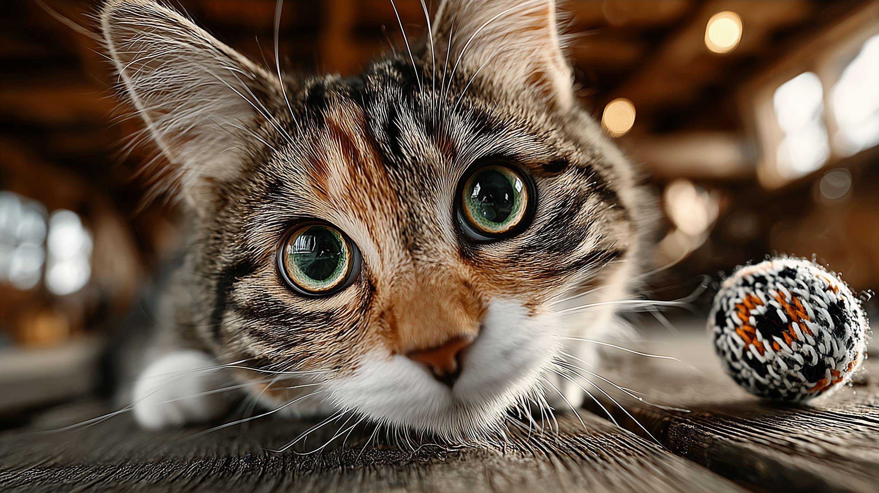 Dieses ansprechende Foto zeigt eine Nahaufnahme einer verspielten Hauskatze, die sich mit einem Wollknäul beschäftigt. Die grünen Augen der Katze blicken direkt in die Kamera, was einen intensiven, fast menschlichen Ausdruck verleiht. Das weiche Fellmuster und die pastelligen Farbtöne in der Umgebung erzeugen eine gemütliche, kuschelige Atmosphäre. Dieses hochauflösende Stockfoto eignet sich perfekt für den Einsatz in Blogbeiträgen, Newslettern, Werbematerialien oder Social-Media-Posts rund um Haustiere, Haustierliebe und Entspannung. Es steht unter einer Creative-Commons-Lizenz zur kostenlosen Nutzung zur Verfügung.