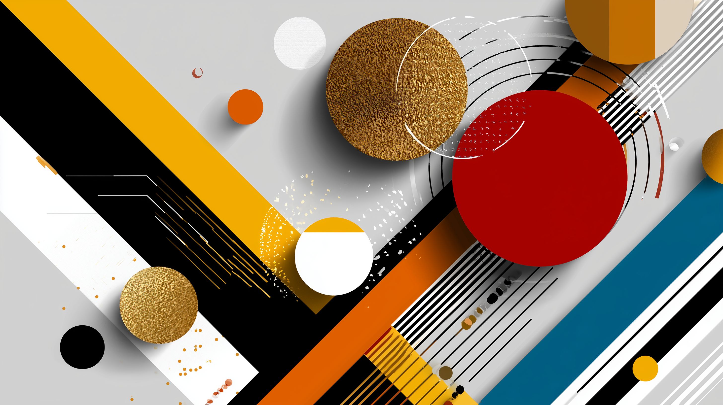 Das Bild zeigt eine abstrakte, moderne Grafik mit einer Komposition aus verschiedenen geometrischen Formen und Farbkontrasten. Im Vordergrund befinden sich mehrere Kreise und Ellipsen in leuchtenden Farben wie Orange, Rot und Gelb, die sich vor einem Hintergrund aus Linien, Punkten und Spritzern in Weiß, Schwarz und Grau abheben. Die Elemente sind in einer asymmetrischen, dynamischen Anordnung platziert, was dem Bild eine spannende, energetische Wirkung verleiht.