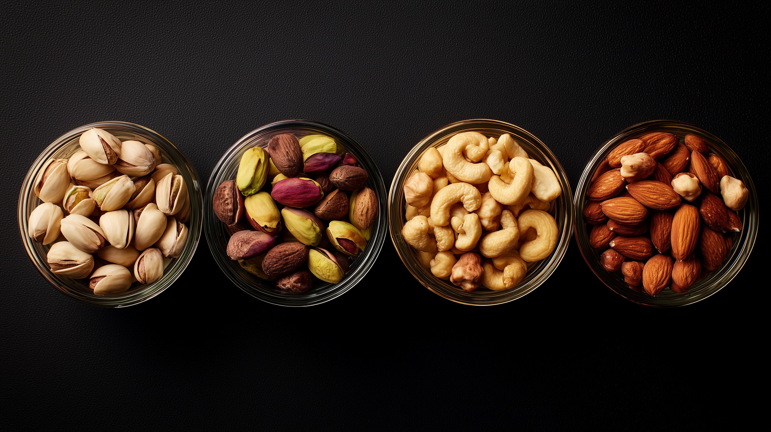 Dieses Stockfoto zeigt eine Auswahl verschiedener Nussarten in Glasbehältern auf einem dunklen Hintergrund. Die Nüsse sind in vier einzelne Schalen angeordnet und bieten einen stilvollen, minimalistischen Blick auf diese beliebten Snacks. Die Aufnahme ist ideal für Lebensmittel-, Ernährungs- oder Gastronomie-Themen und lässt sich hervorragend in Blogs, Newslettern oder Social-Media-Posts einsetzen. Das hochauflösende Bild steht unter einer Creative-Commons-Lizenz zur kostenlosen Nutzung zur Verfügung.