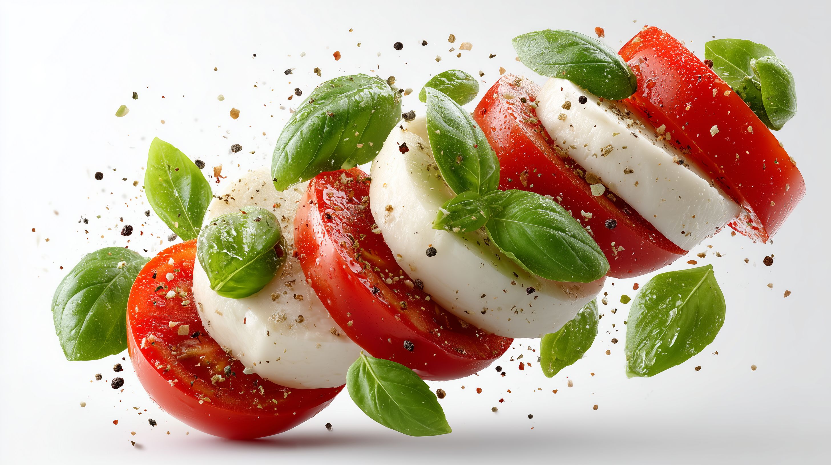 Dieses Foto zeigt einen klassischen Caprese-Salat, bestehend aus reifen Tomaten, cremigem Mozzarella und frischen Basilikumblättern. Die Zutaten sind ansprechend auf einem weißen Hintergrund angeordnet, was den appetitlichen Eindruck unterstreicht. Die Kombination der kräftigen roten Farbe der Tomaten, des weißen Mozzarella und des grünen Basilikums ergibt eine harmonische, farbenfrohe Komposition. Dieses Bild eignet sich hervorragend für den Einsatz in Rezepten, Menüs, Lebensmittelblogs oder Werbematerialien rund um mediterrane Küche und gesunde Ernährung. Als hochauflösendes, kostenloses Stockfoto unter Creative-Commons-Lizenz ist es flexibel in verschiedensten Projekten einsetzbar.