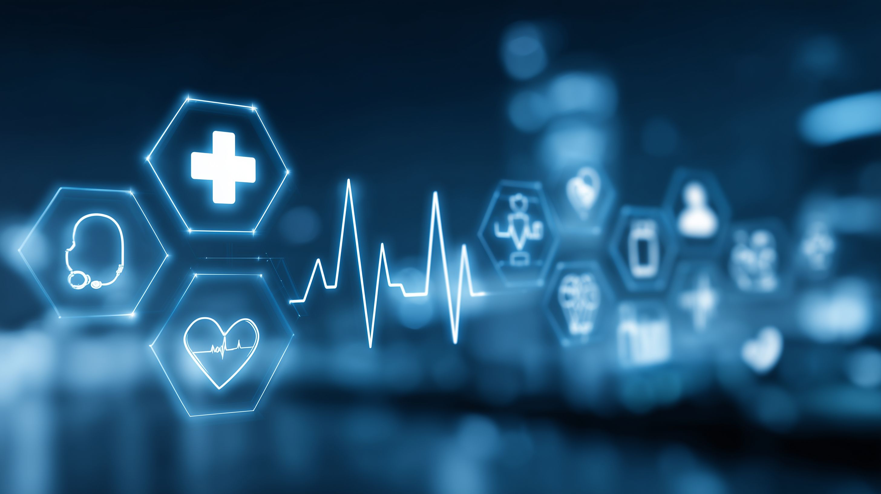 Das Bild zeigt eine Reihe digitaler Medizinsymbole wie Stethoskop, Pille und Herzfrequenzgrafik auf einem dunkelblauen, technologisch anmutenden Hintergrund. Die Symbole leuchten in einem hellen Blauton, was eine moderne, klinische Atmosphäre erzeugt. Dieses Stockfoto eignet sich hervorragend als Hintergrundbild für Blog-Beiträge, Newsletter oder Social-Media-Postings rund um Gesundheitsthemen, medizinische Dienstleistungen oder Wellness. Es ist in hoher Auflösung verfügbar und unter einer Creative-Commons-Lizenz kostenfrei nutzbar.
