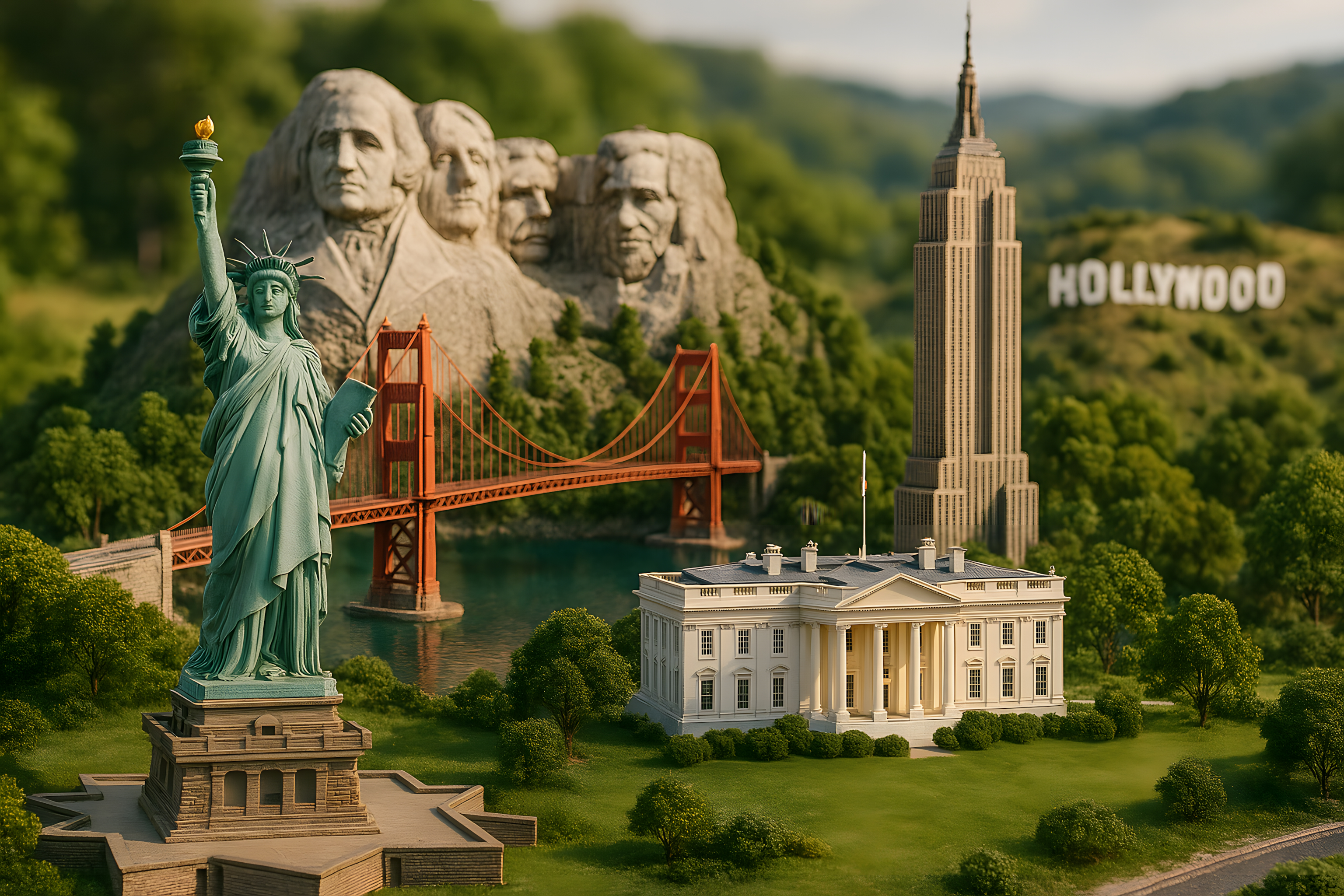 Dieses Foto zeigt eine malerische Miniaturansicht bekannter Wahrzeichen und Attraktionen der Vereinigten Staaten. Zu sehen sind unter anderem die Freiheitsstatue, die Golden Gate Bridge, das Empire State Building und das Hollywood-Schild, eingebettet in eine idyllische Landschaft mit Bergen und Wäldern im Hintergrund. Das faszinierende Diorama vermittelt einen einzigartigen Blick auf diese ikonischen amerikanischen Sehenswürdigkeiten in einem stimmungsvollen, kleinteiligen Setting. Dieses kostenlose Stockfoto in hoher Auflösung kann vielfältig für Blogs, Newsletter, Social-Media-Beiträge oder Werbezwecke unter Creative-Commons-Lizenz genutzt werden.