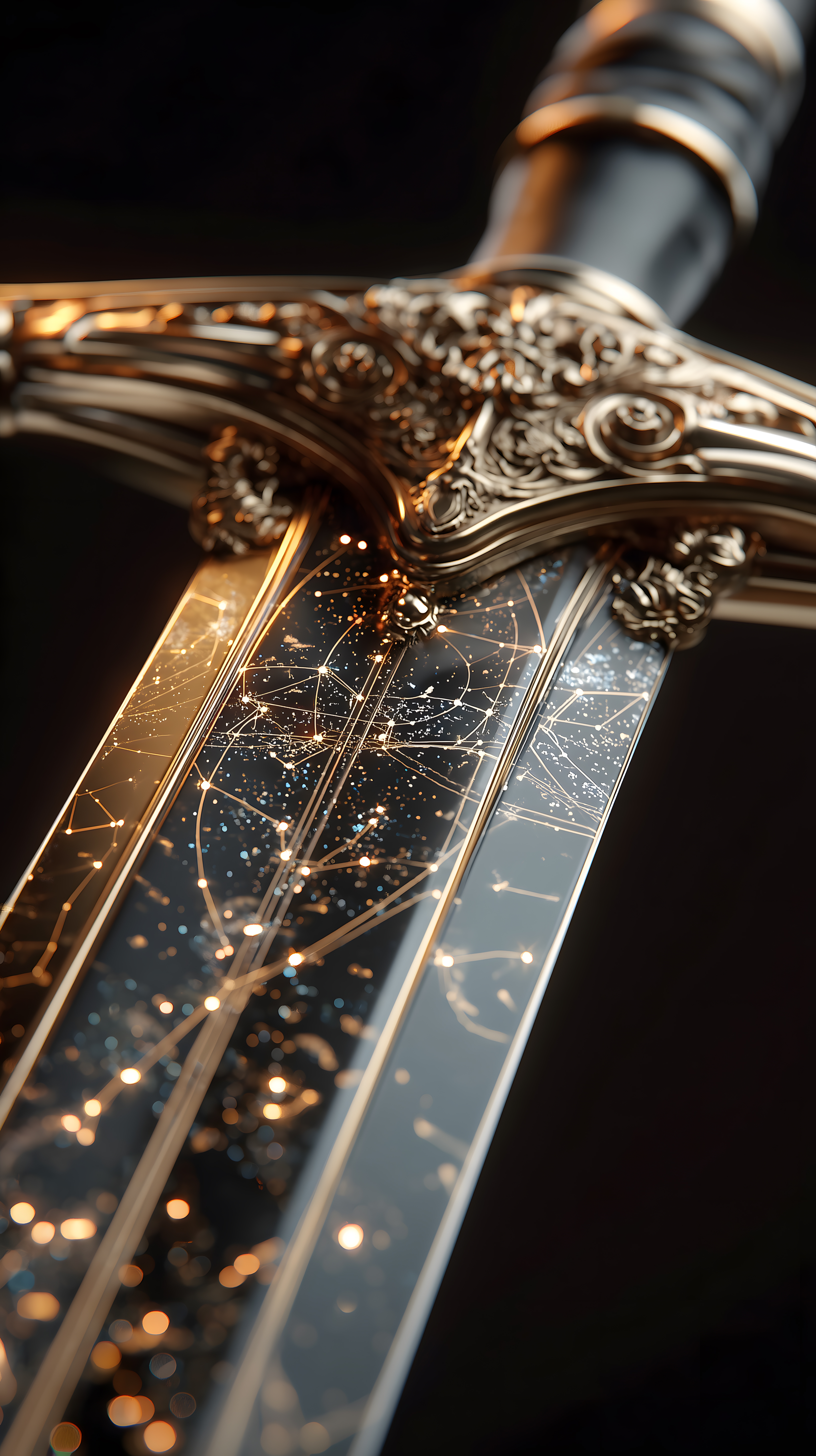 Das Bild zeigt ein dekoratives Ritterschwert mit einer aufwendigen, goldenen Verzierung. Die Klinge des Schwertes ist von einer Sternenkonstellation umgeben, die einen mystischen und fantastischen Eindruck vermittelt. Das Schwert ist vor einem dunklen Hintergrund platziert, wodurch die Details und der Glanz der Verzierung besonders hervorgehoben werden. Dieses hochauflösende Stockfoto eignet sich hervorragend für den Einsatz in Blogs, Newslettern, Social-Media-Beiträgen oder Werbematerialien, bei denen eine stimmungsvolle, mittelalterlich-mystische Optik gewünscht ist. Das Bild ist unter einer Creative-Commons-Lizenz kostenfrei nutzbar.